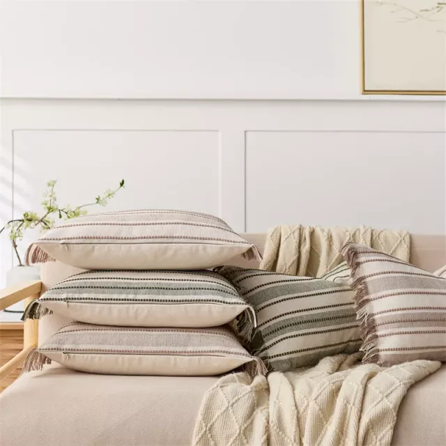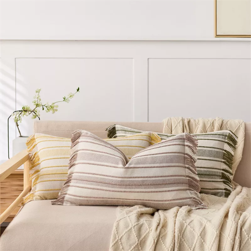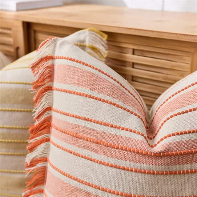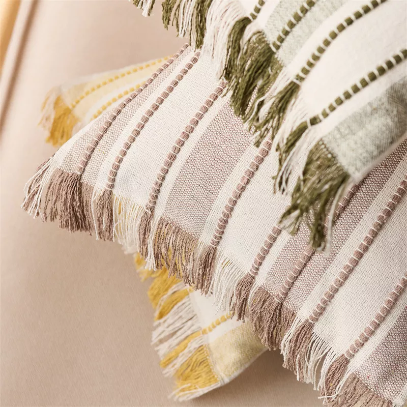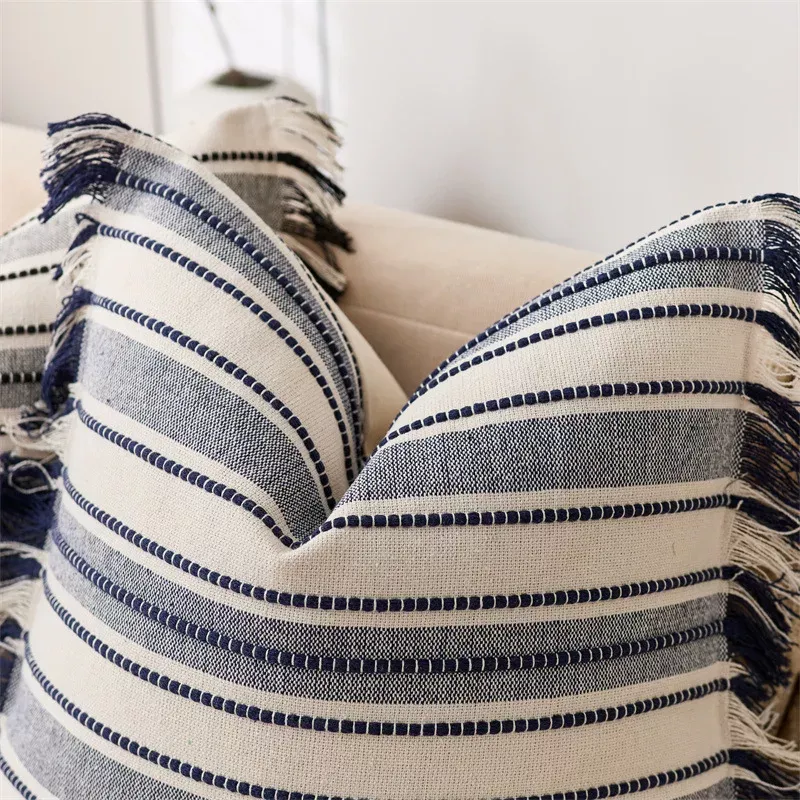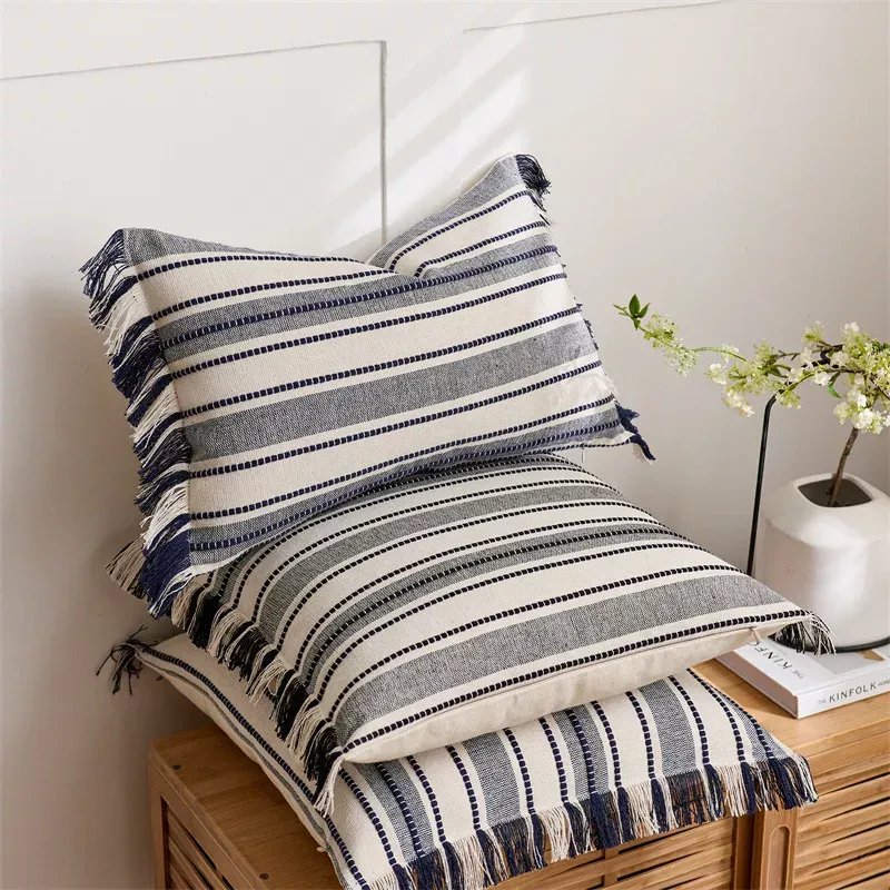 Crafted using a yarn-dyed jacquard technique, this cushion cover showcases a stylish geometric stripe pattern that feels both modern and timeless. Tassel fringes on each corner add a soft, artisanal charm while maintaining a sleek, contemporary feel.