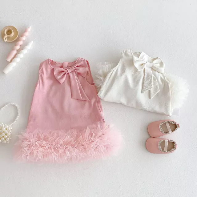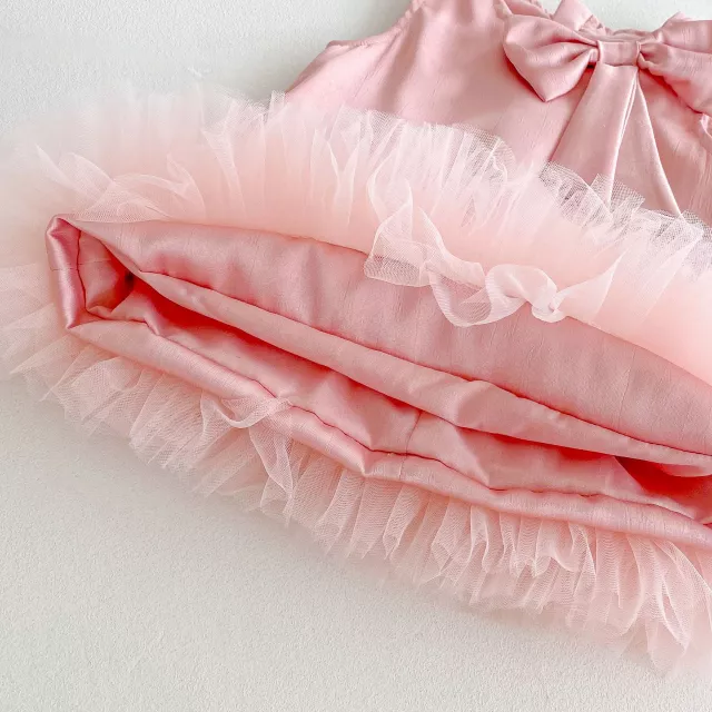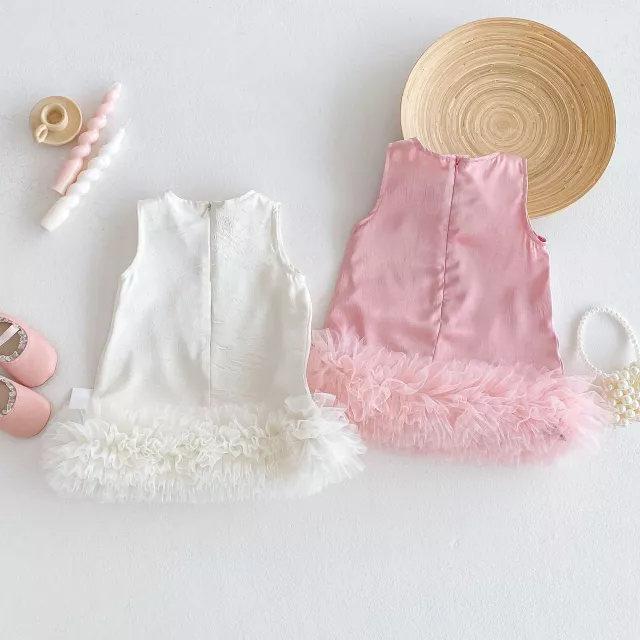 This beautiful A-line dress features a sleeveless design and a flowy silhouette that allows for easy movement—ideal for active toddlers and young girls. The large decorative bow at the chest adds a delightful touch of cuteness, while the dreamy, ruffled tulle hem gives it a princess-like finish. With solid color options in soft pink and classic white, it’s a timeless piece that complements any occasion.