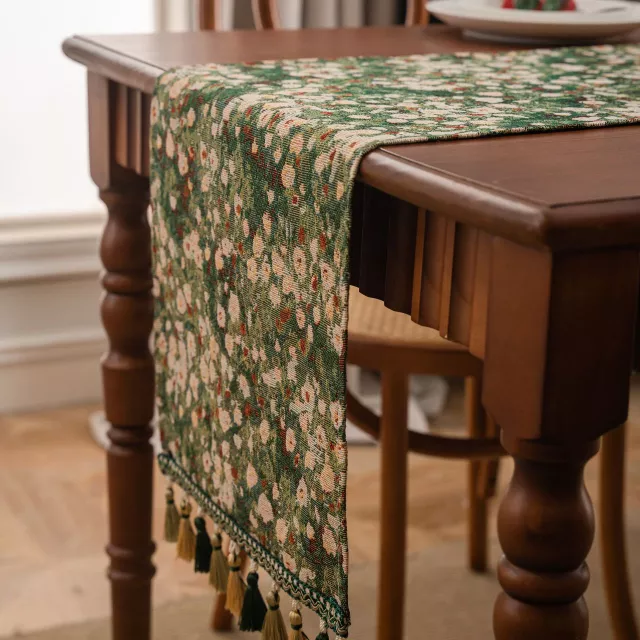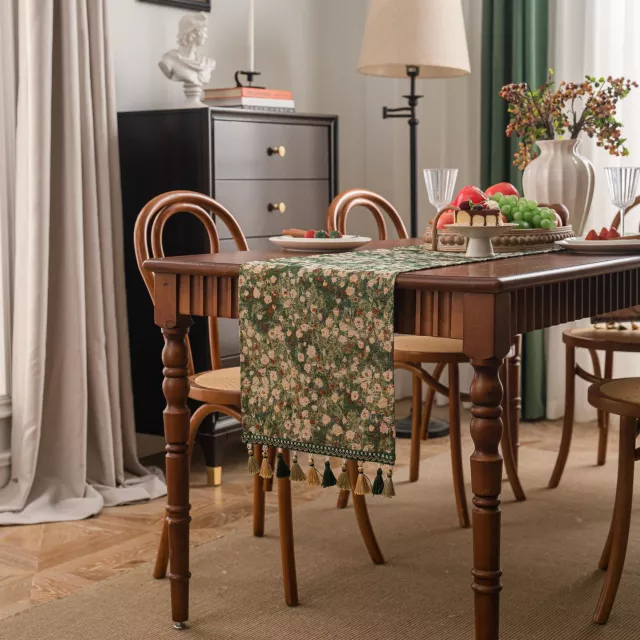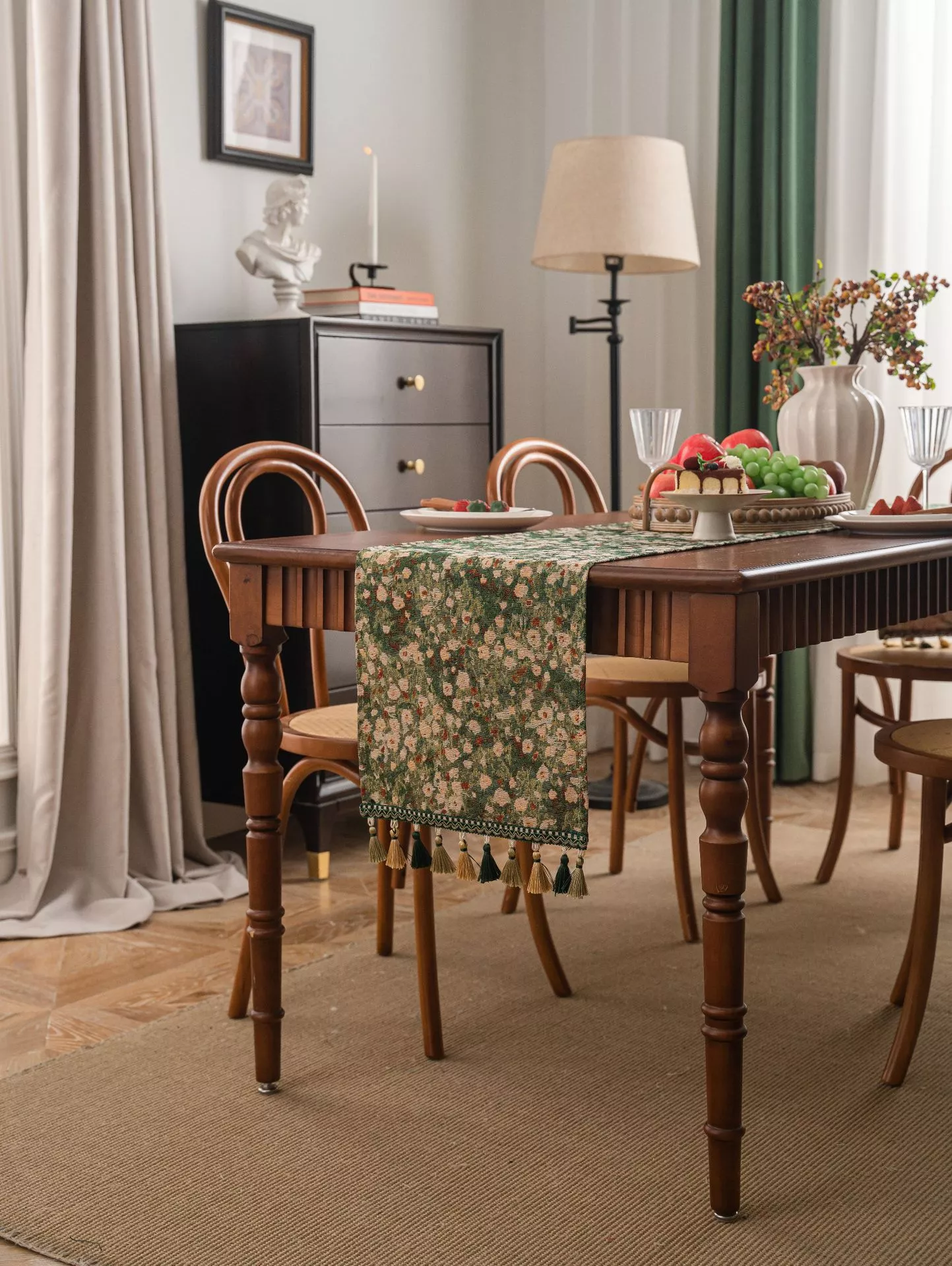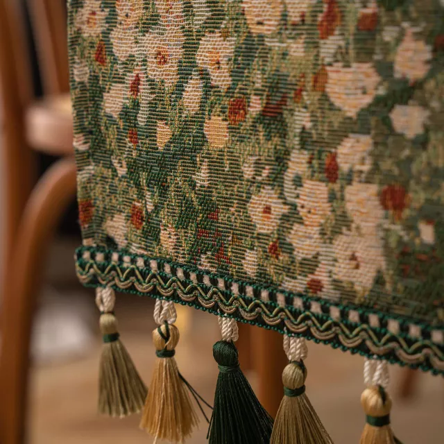 Whether placed on a dining table, tea table, or console, this long strip runner instantly becomes a beautiful focal point. The added tassel fringe at both ends adds a classic decorative touch, making it a charming accent piece for vintage-inspired, farmhouse, or traditional décor. Its jacquard weaving technique gives it a rich texture that elevates any table setting with ease.