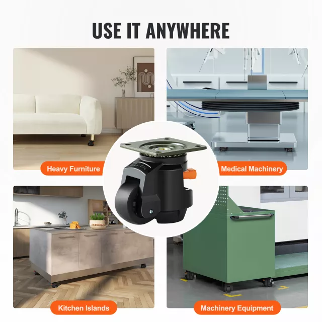 These leveling casters stand out for their blend of strength, precision, and ease of use. Perfect for anyone needing reliable mobility for heavy items, they excel in both residential and industrial settings. The unique handle feature makes adjusting the height quick and hassle-free, so you can keep your workspace level without the guesswork. Plus, the vibration-dampening rubber wheels protect your floors and equipment while offering smooth, silent movement.