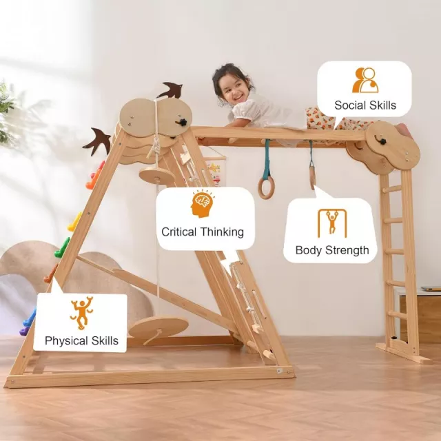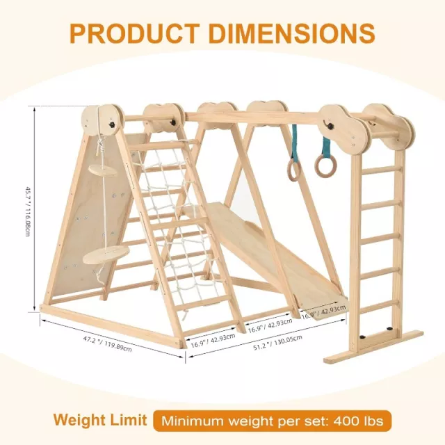 This indoor jungle gym comes packed with exciting features to help children climb, swing, slide, and explore while strengthening their bodies and sharpening their minds. Built from sturdy, industrial-grade pine wood, it’s both safe and durable—perfect for active toddlers and energetic preschoolers.