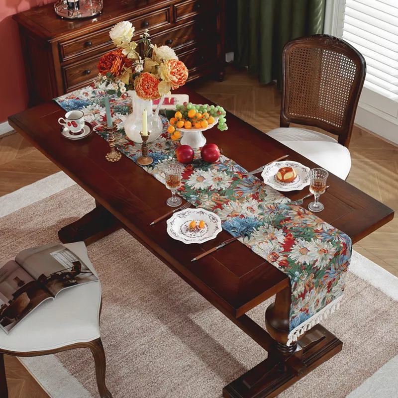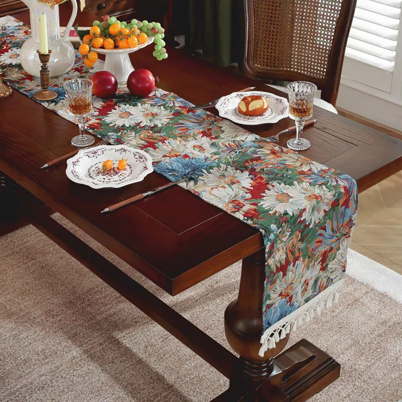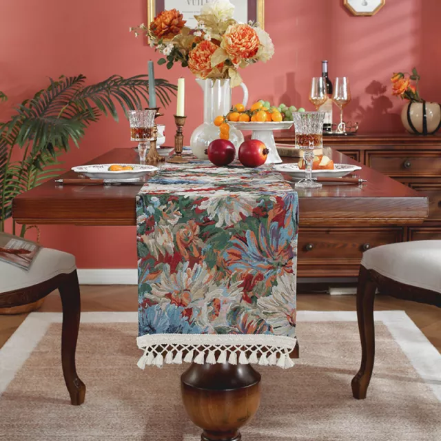 Transform your living space with this exquisite Jacquard Plant Flower Table Runner, designed to add a touch of American retro charm to any room. Perfect for coffee tables, TV cabinets, or party settings, this beautifully woven table runner features delicate floral embroidery and elegant tassels that create a warm, inviting atmosphere. Crafted from 100% polyester, it blends durability with style, making it a practical yet decorative addition to your home.