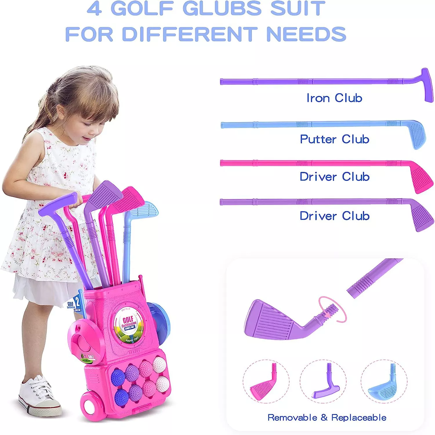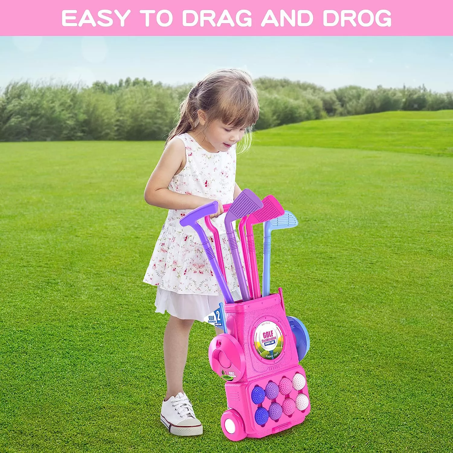 Kids Pink Golf Club Set with Putting Mat, 4 Clubs & Wheeled Cart for Toddlers
