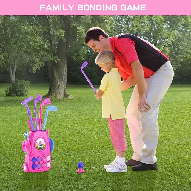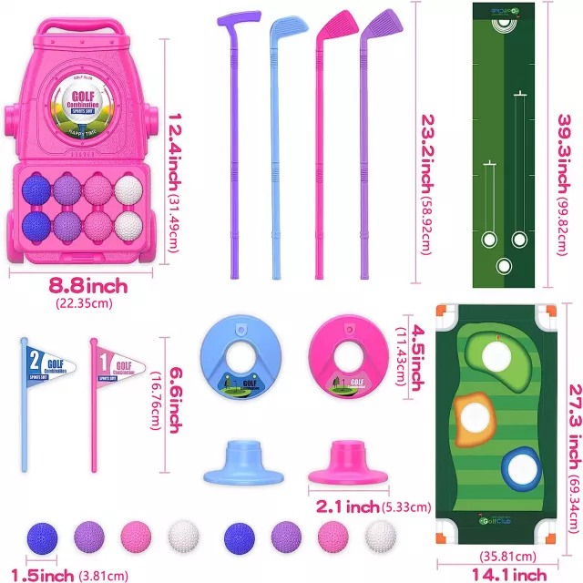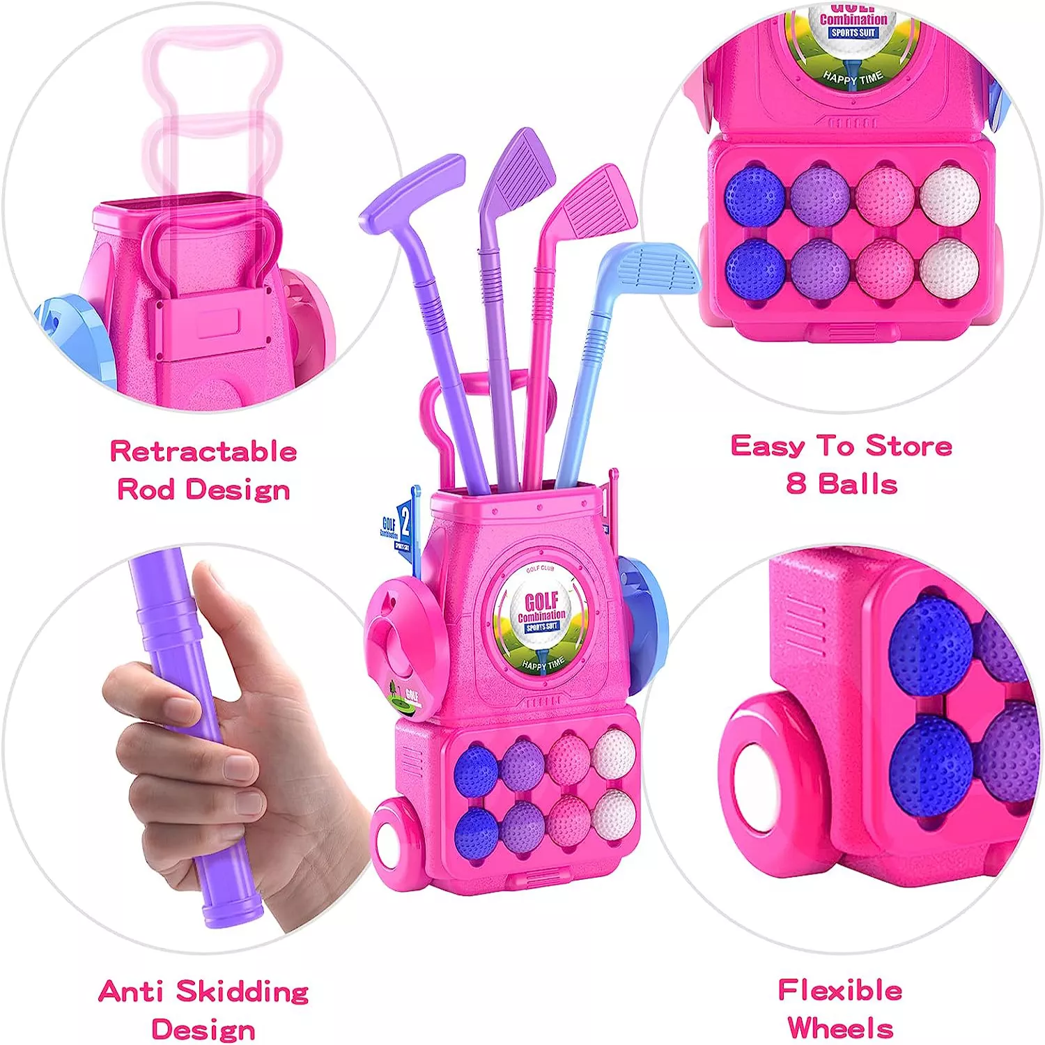 This kids golf set comes with four lightweight golf clubs crafted from durable polyethylene, making them safe and easy for small hands to grip and swing. The bright pink design adds a fun and friendly touch, inspiring your child to keep practicing. The included putting mat offers a smooth, realistic surface to help your child improve their aim and focus. The wheeled golf cart makes transporting clubs around the house or yard simple and adds an extra layer of imaginative play.