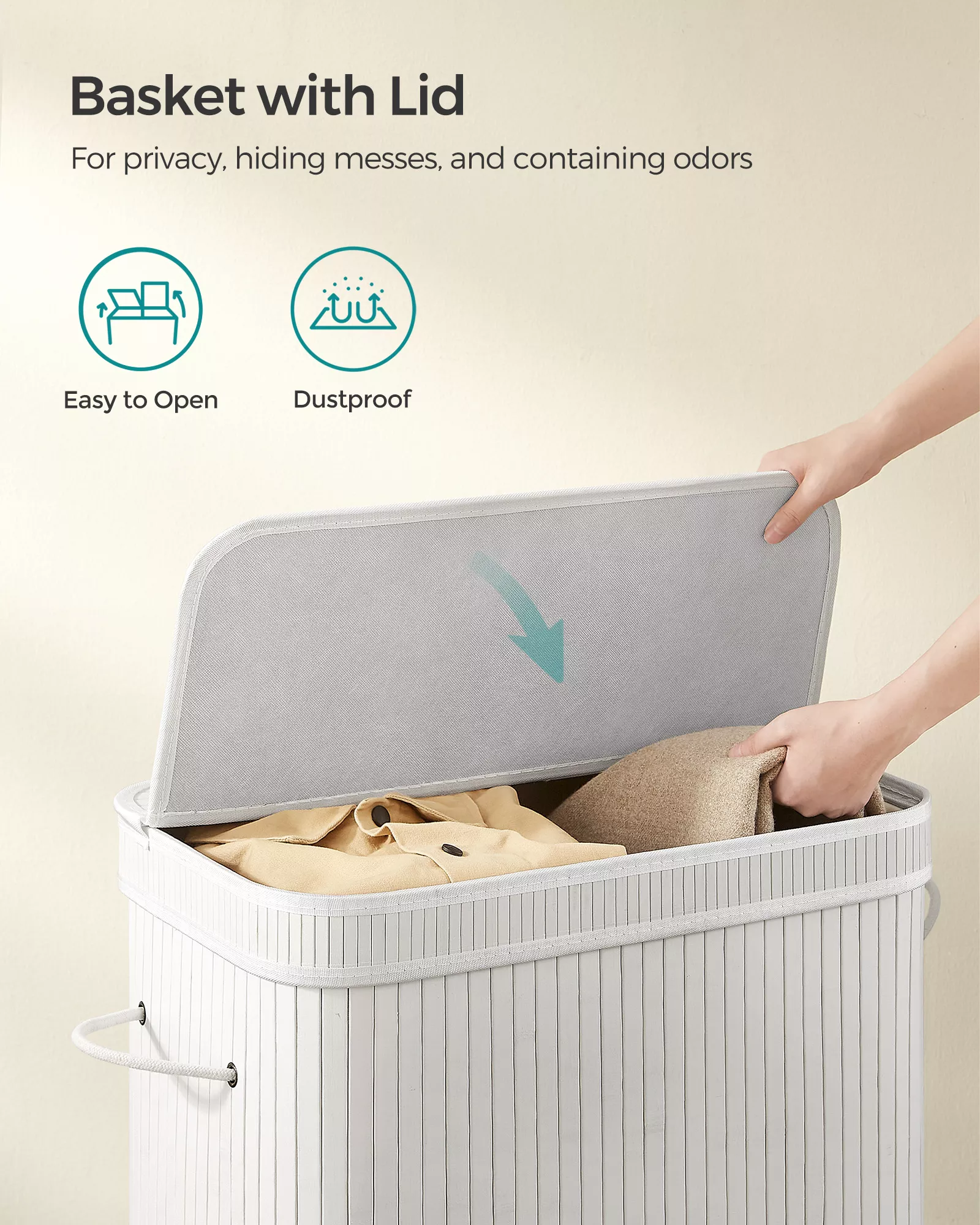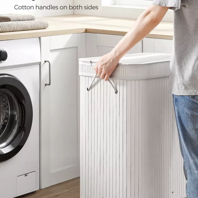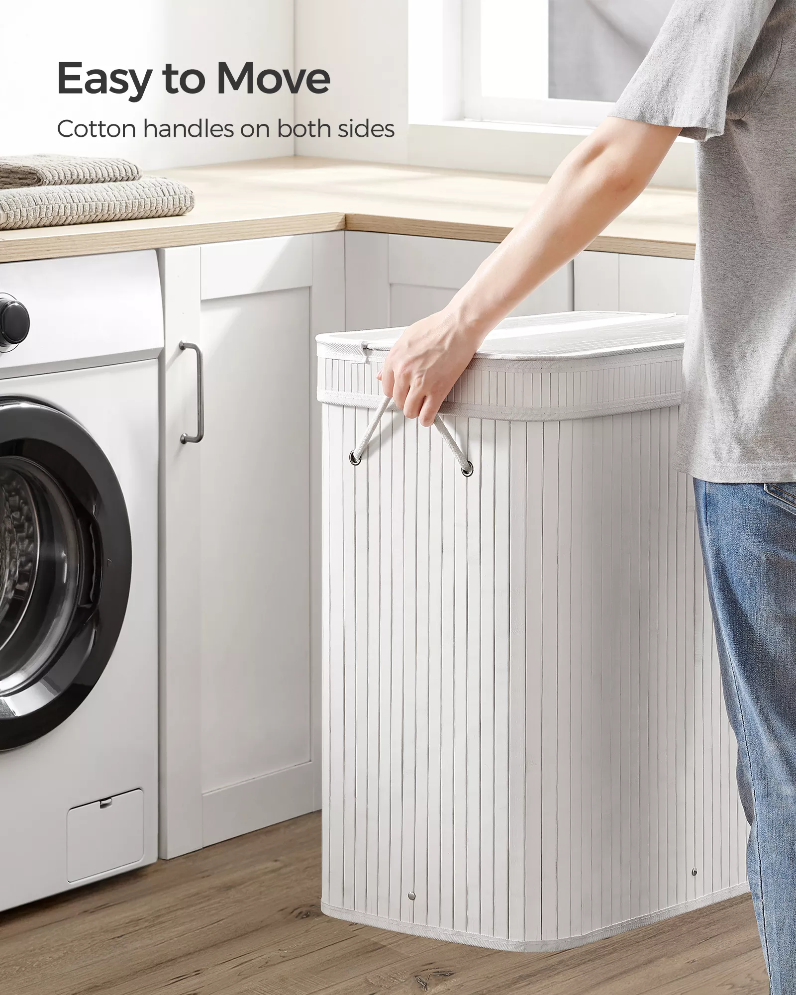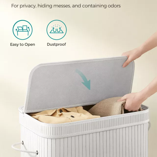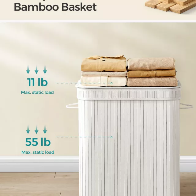 Constructed with 17 mm wide bamboo slats supported by a sturdy metal frame, this hamper offers excellent stability and can hold up to 55 pounds of laundry. The thoughtfully designed lid opens effortlessly with one hand, making it simple to toss in laundry and keep everything hidden away from view and dust. When not in use, the basket easily folds flat for convenient storage.