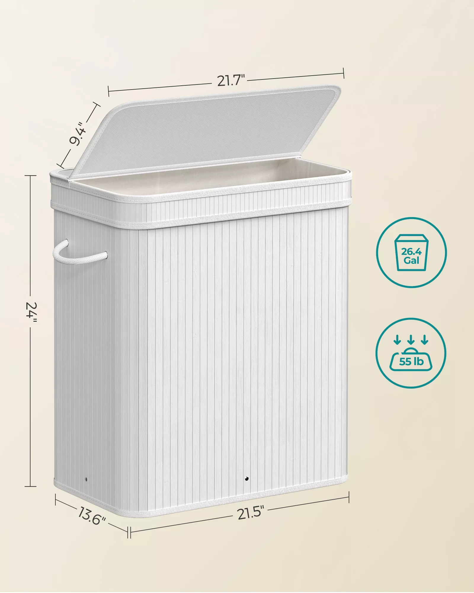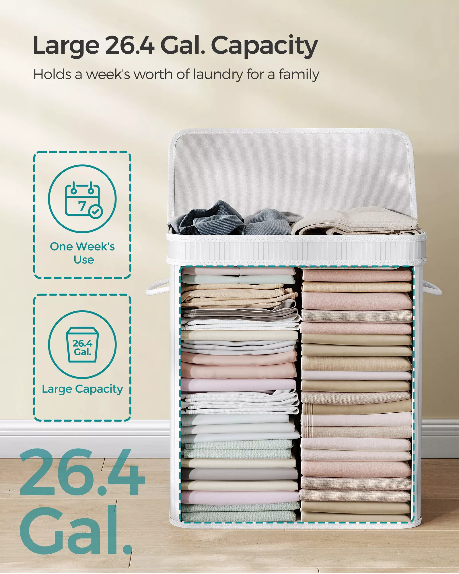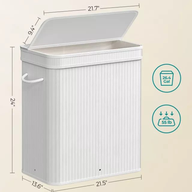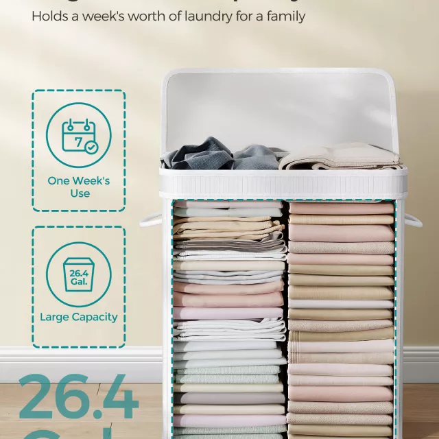 Keep your laundry area neat and attractive with this large bamboo laundry hamper featuring a sleek lid and removable washable liner. Designed to hold up to 26.4 gallons, it’s perfect for storing a week’s worth of clothes, towels, blankets, and pillows. Its natural bamboo finish adds a warm, modern touch to any room, blending seamlessly with your home décor.
