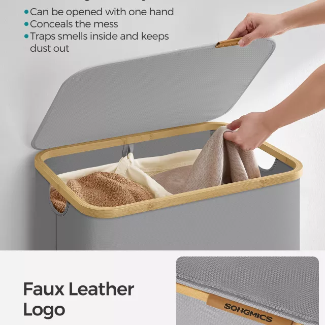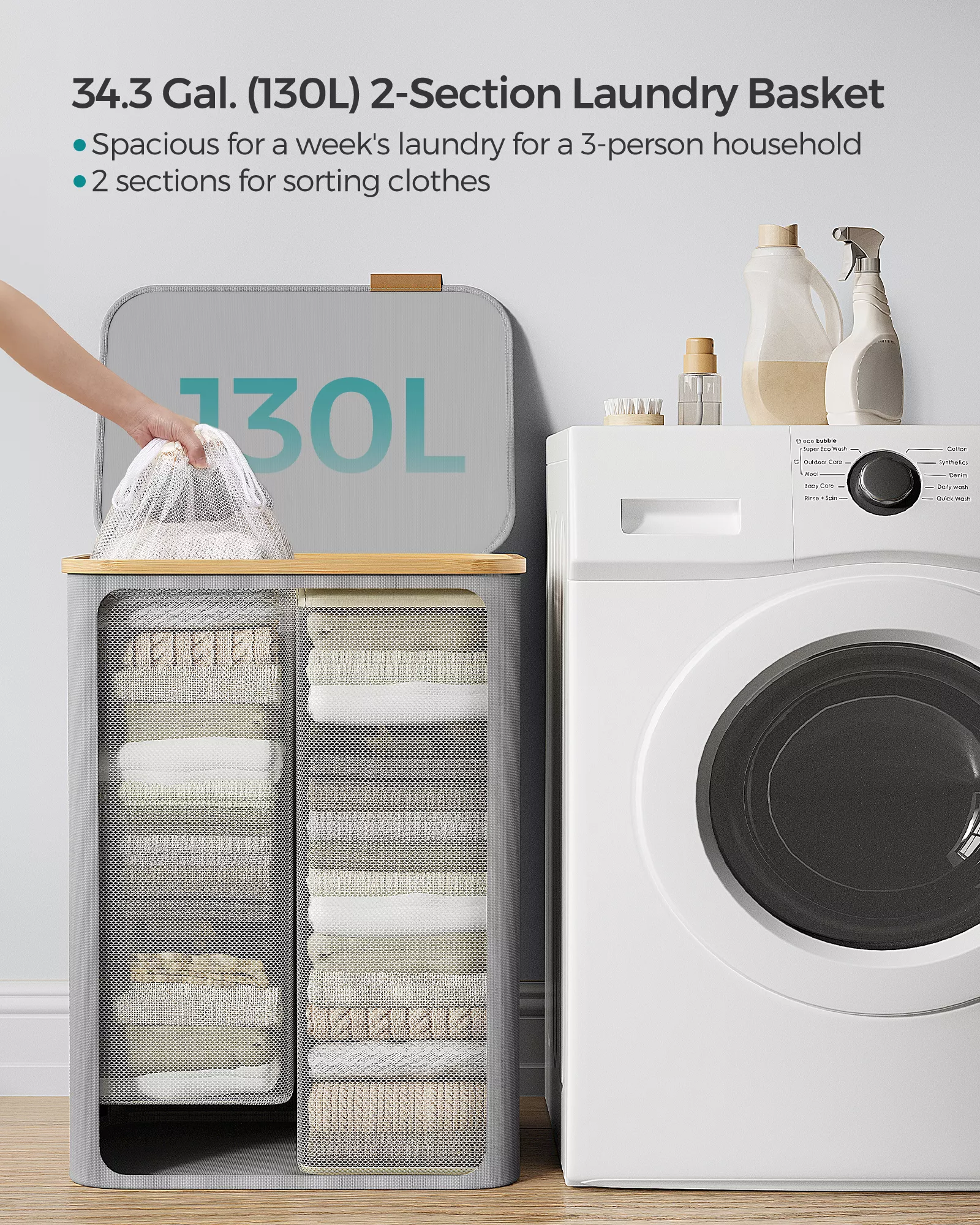 Say goodbye to laundry chaos with this spacious 2-section laundry hamper designed to simplify sorting and storage. With a generous 34.3-gallon capacity, it’s perfect for a small family or shared living space, allowing you to separate clothes easily without extra bins. The modern design features a sleek lid with an elegant faux leather handle, keeping your laundry out of sight and your room looking tidy.
