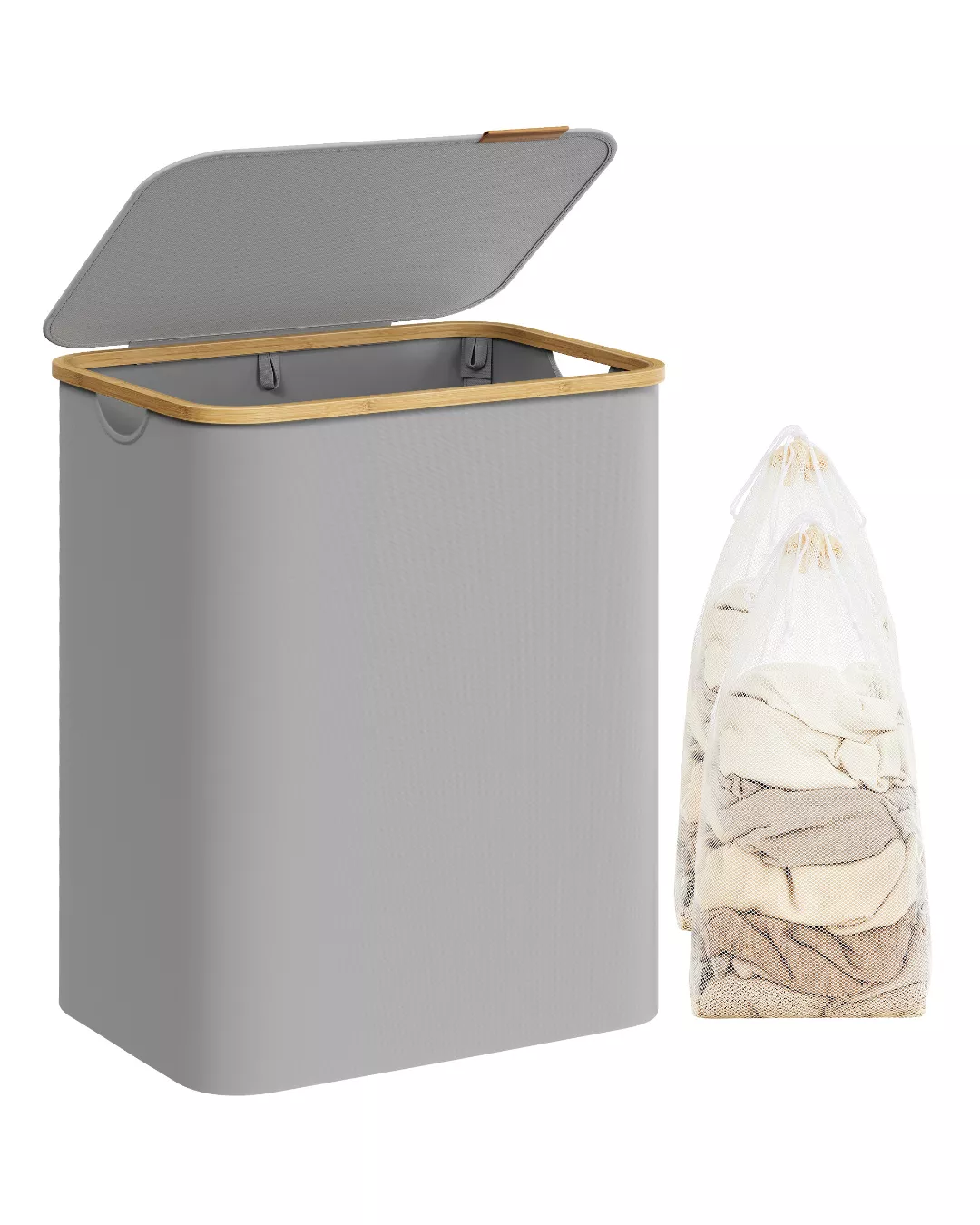 Crafted from water-resistant and tear-resistant 600D Oxford fabric, this hamper is built to last. Reinforced with fiberglass rods, it stands sturdy and stable even when fully loaded. The bamboo handles add a natural touch and make moving the hamper effortless. Plus, its compact size of 20.5” long by 15.2” wide and 27.8” high fits neatly into closets, bathrooms, or laundry rooms.