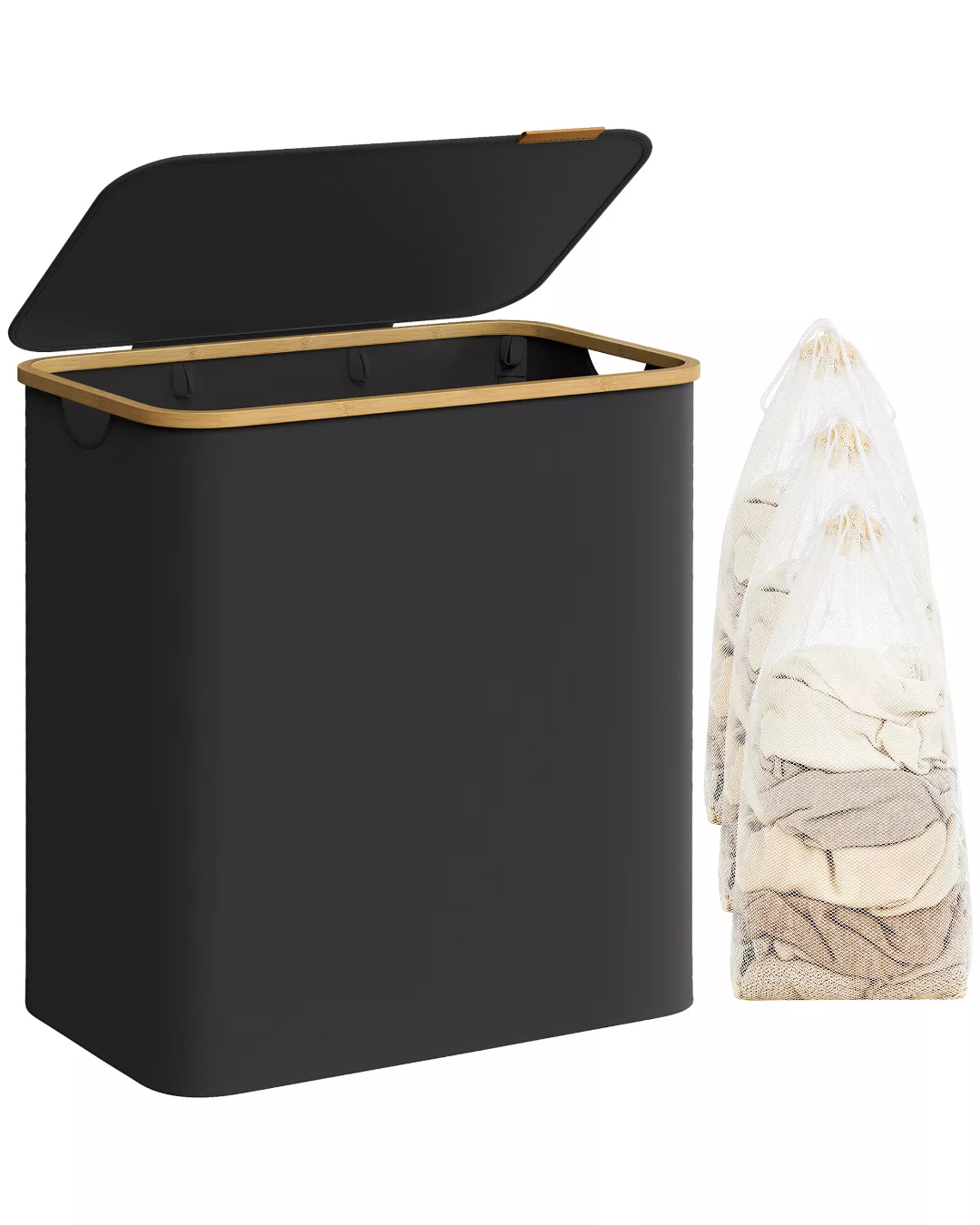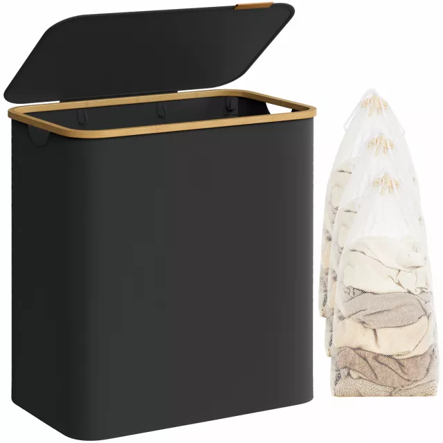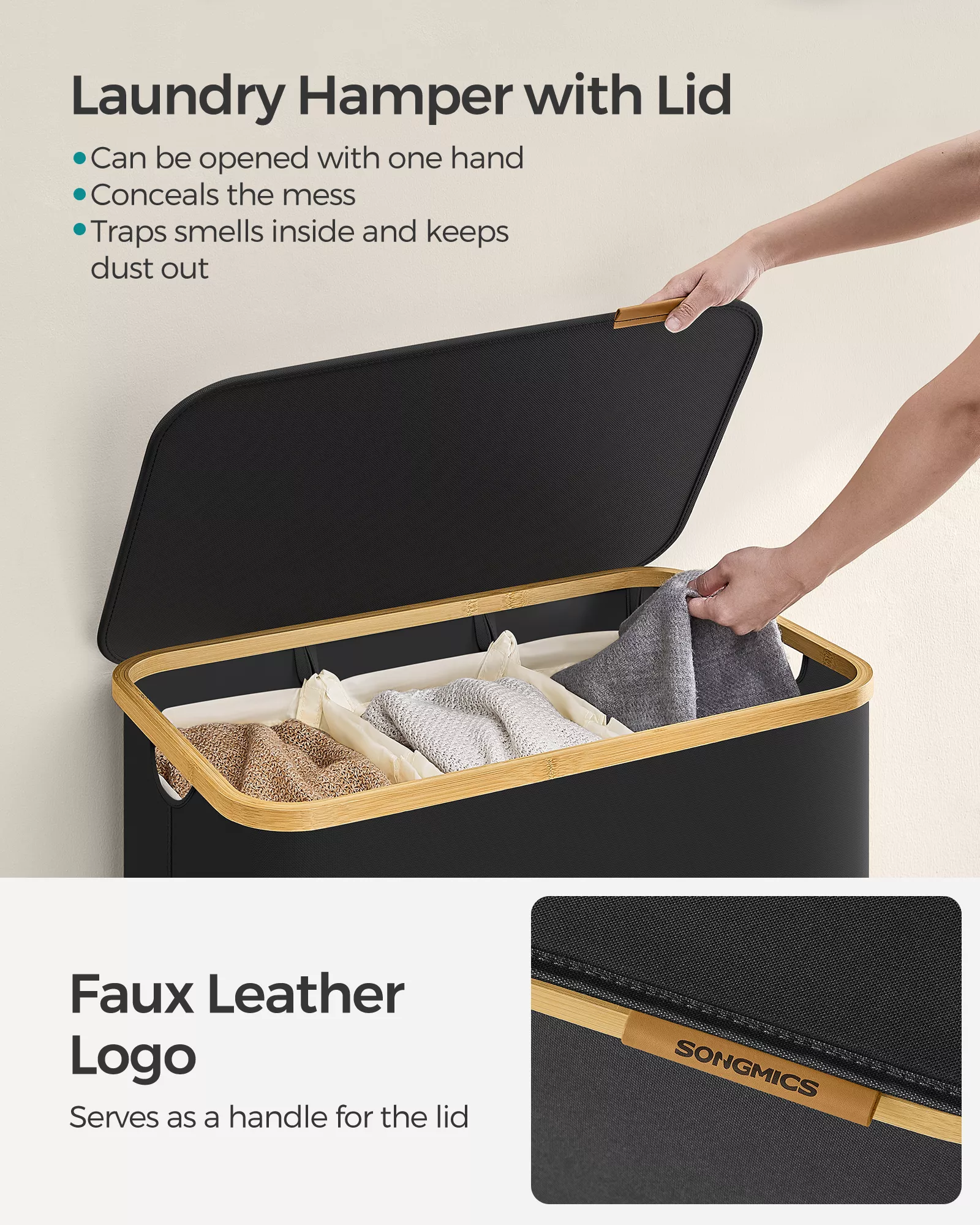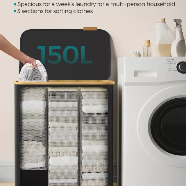 Keep your laundry routine smooth and clutter-free with this large 3-section laundry hamper, designed to meet the needs of a multi-person household. Offering an impressive 52.8-gallon capacity, this hamper lets you easily sort clothes by color, fabric, or family member in one stylish unit. Its sleek black finish and elegant faux leather handle on the lid add a modern touch while hiding laundry mess from view.