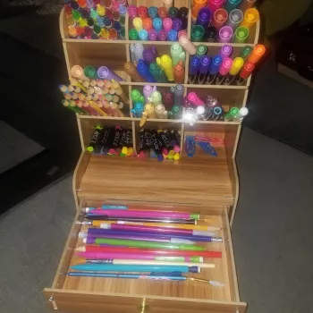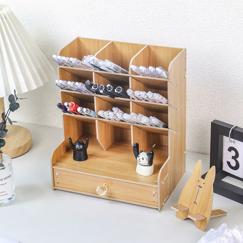 As an artist, I have tons of supplies that need organizing and this large-capacity wooden desk organizer was just what I needed. It holds everything from pens and markers to scissors and tape while still managing to look stylish on my work table. A truly functional piece!
