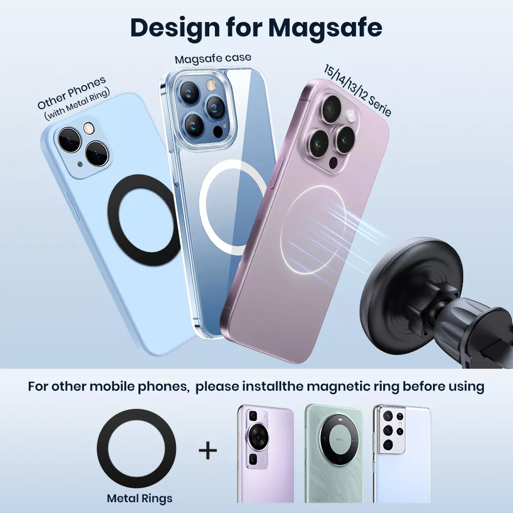 Equipped with 20 precisely arranged permanent magnets, this car phone holder ensures your device stays firmly in place, no matter how rough the road gets. For phones without MagSafe or with non-compatible cases, an extra adhesive metal ring is included, allowing you to easily attach the holder without interfering with your phone’s signal or charging ability. The strong magnet instantly aligns and secures your device for quick, one-handed operation, making navigation and calls safer while driving.