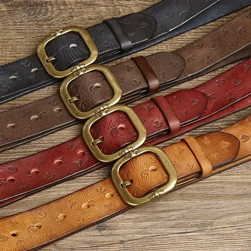 Made from pure, full-grain cowhide leather, this belt is thick, durable, and built to last through every season. The belt features an embossed texture for added character and a solid copper pin buckle that brings a vintage touch while ensuring a firm, reliable fit. Available in a range of versatile colors—black, brown, khaki, red, and deep coffee—this belt is designed to complement any wardrobe.