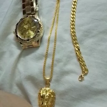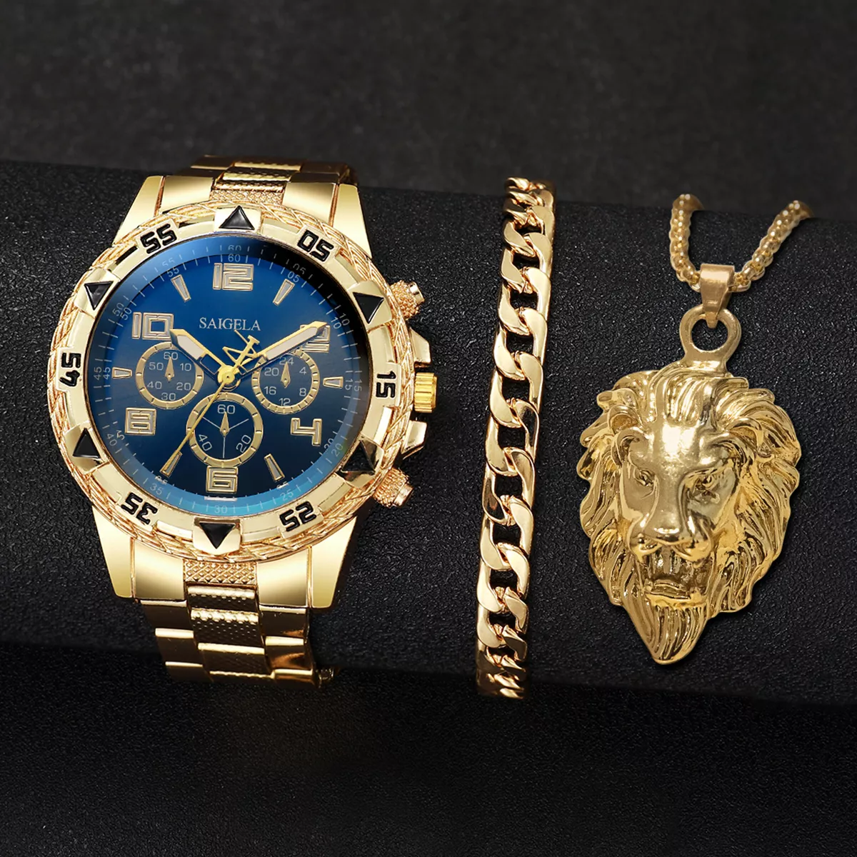 What a fantastic find! I've been on the lookout for something like this for quite some time. The watch, bracelet, and necklace combo is just perfect – each piece complements the other beautifully. It's clear that they're all made from durable alloy because even after daily use, they still look as polished and shiny as when I first got them. The quartz movement of the watch has proven to be incredibly reliable too; it keeps accurate time without needing much maintenance at all. Plus, the bold design really stands out – whether I'm in a business meeting or out on a date night with my wife. All in all, an excellent purchase.