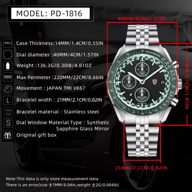 With a polished stainless steel body, luminous hands, and a durable sapphire crystal mirror, this watch is more than an accessory — it’s a commitment to quality. The numberless dial and minimalist face offer a clean, contemporary look while the chronograph and stopwatch features provide precise functionality. The screw-down crown and 10Bar water resistance give you the confidence to wear it anywhere, anytime.
