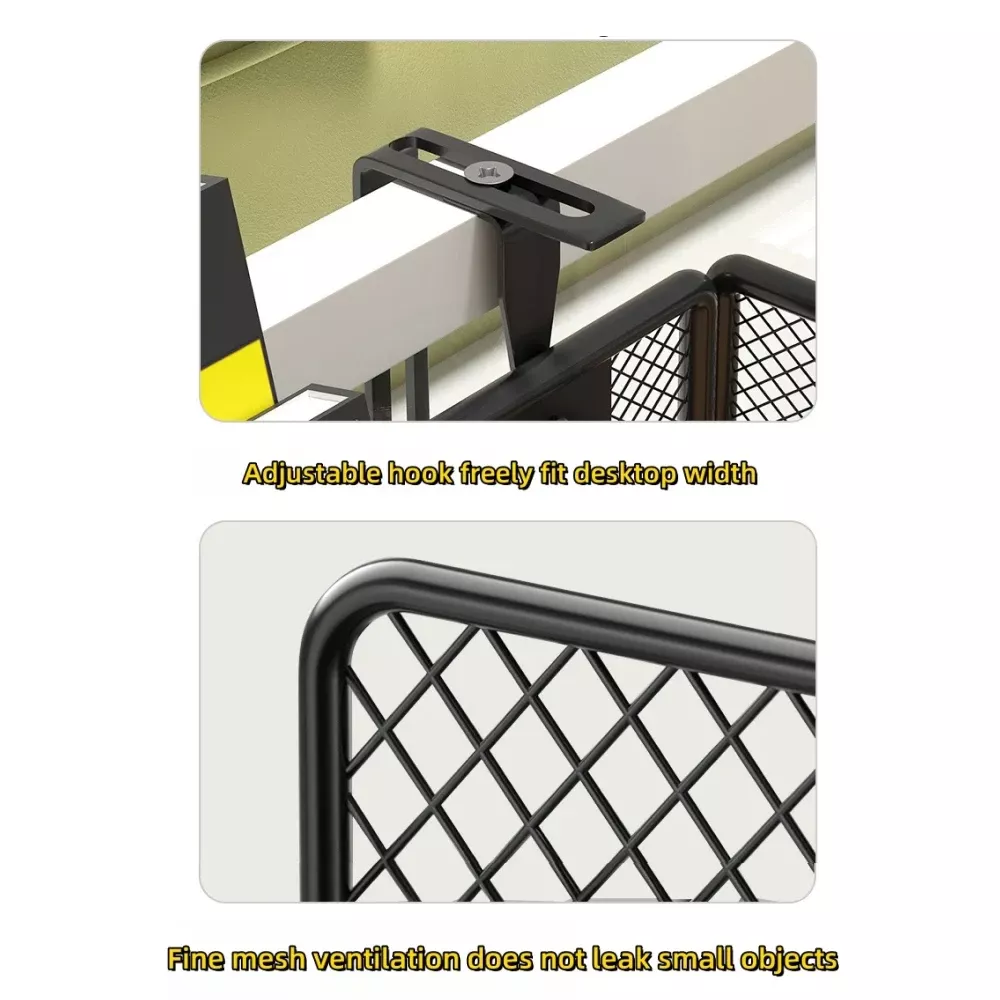 Crafted from durable metal with a sleek black finish, this storage basket is built to last and resist daily wear. The open-grid design offers a modern look while providing ventilation to prevent dust buildup. It easily hooks onto desks, tables, shelves, or partitions with the complimentary hook included in every purchase. Measuring perfectly to hold notebooks, office supplies, stationery, or even small gadgets, it’s an ideal solution for anyone looking to maximize space without compromising on style.