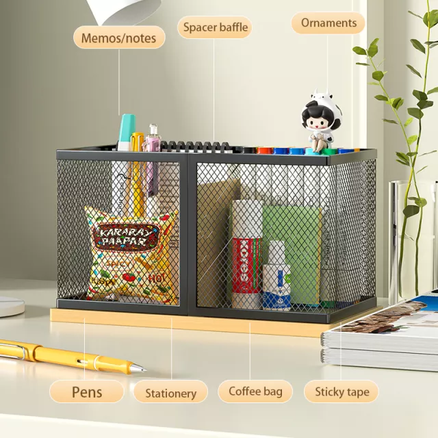 this desk organizer is an excellent addition to my workspace the metal mesh provides durability and ventilation while the bamboo-style exterior adds a warm, natural aesthetic that brightens the room it holds pens, pencils, and small office essentials securely and prevents clutter the lightweight yet sturdy design makes it easy to move and clean