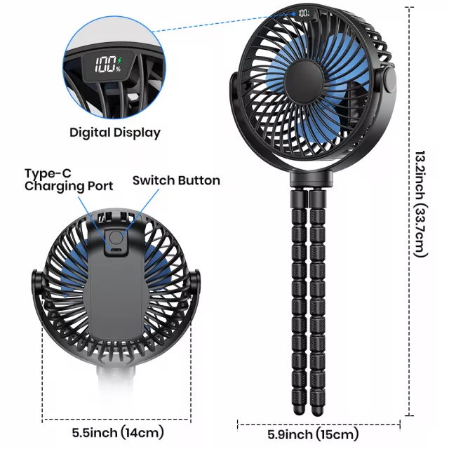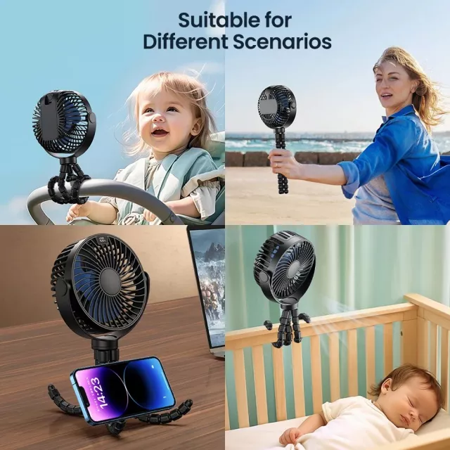 This fan is more than just a breeze—it’s built for real-life needs. Featuring a rechargeable 5000mAh battery, it runs continuously for up to 24 hours on a single charge. Its flexible, octopus-style tripod wraps securely around almost any surface—whether it’s a stroller handle, car seat bar, or crib rail. The 360° rotatable head and four adjustable speeds let you control the airflow direction and intensity, giving you full customization for every situation. The built-in LED power display ensures you’ll always know when it’s time to recharge.