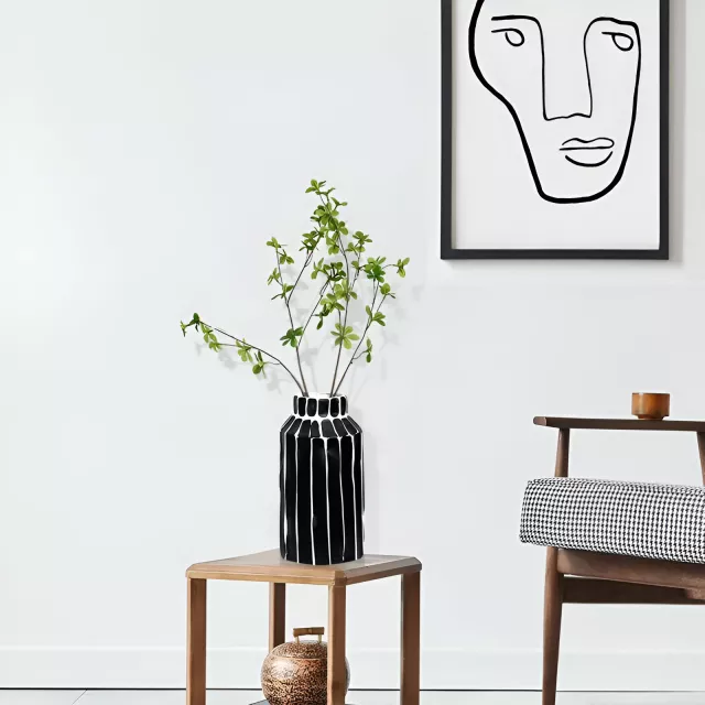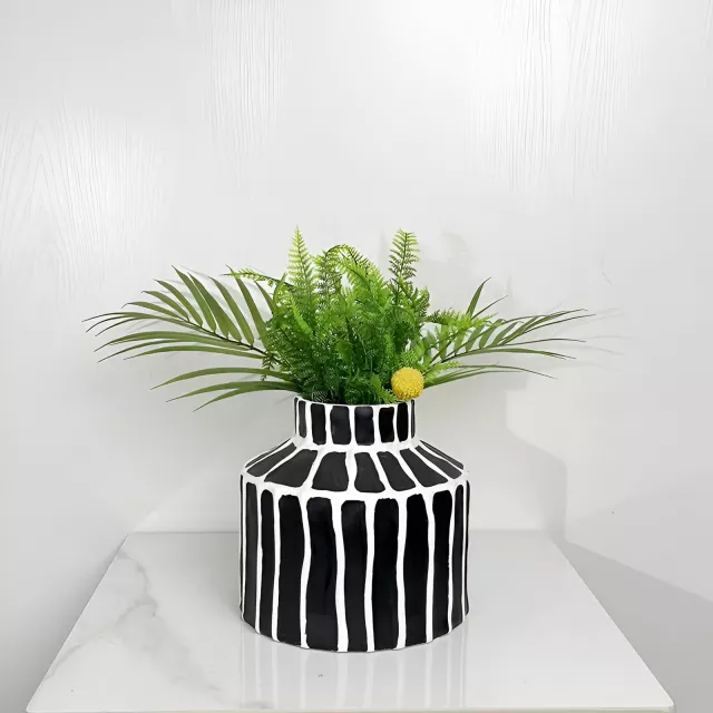 Turn any ordinary tabletop into a conversation starter with this Modern Black and White Striped Ceramic Vase. Designed with clean lines and bold contrast, this decorative piece brings a refined, modern edge to any room. Whether you’re styling your living room, dressing up a hallway console, or enhancing a showroom, this vase effortlessly blends function and flair. With its eye-catching geometric fringe design, it makes a stunning base for fresh or dried floral arrangements, or even stands beautifully on its own as a minimalist ornament.