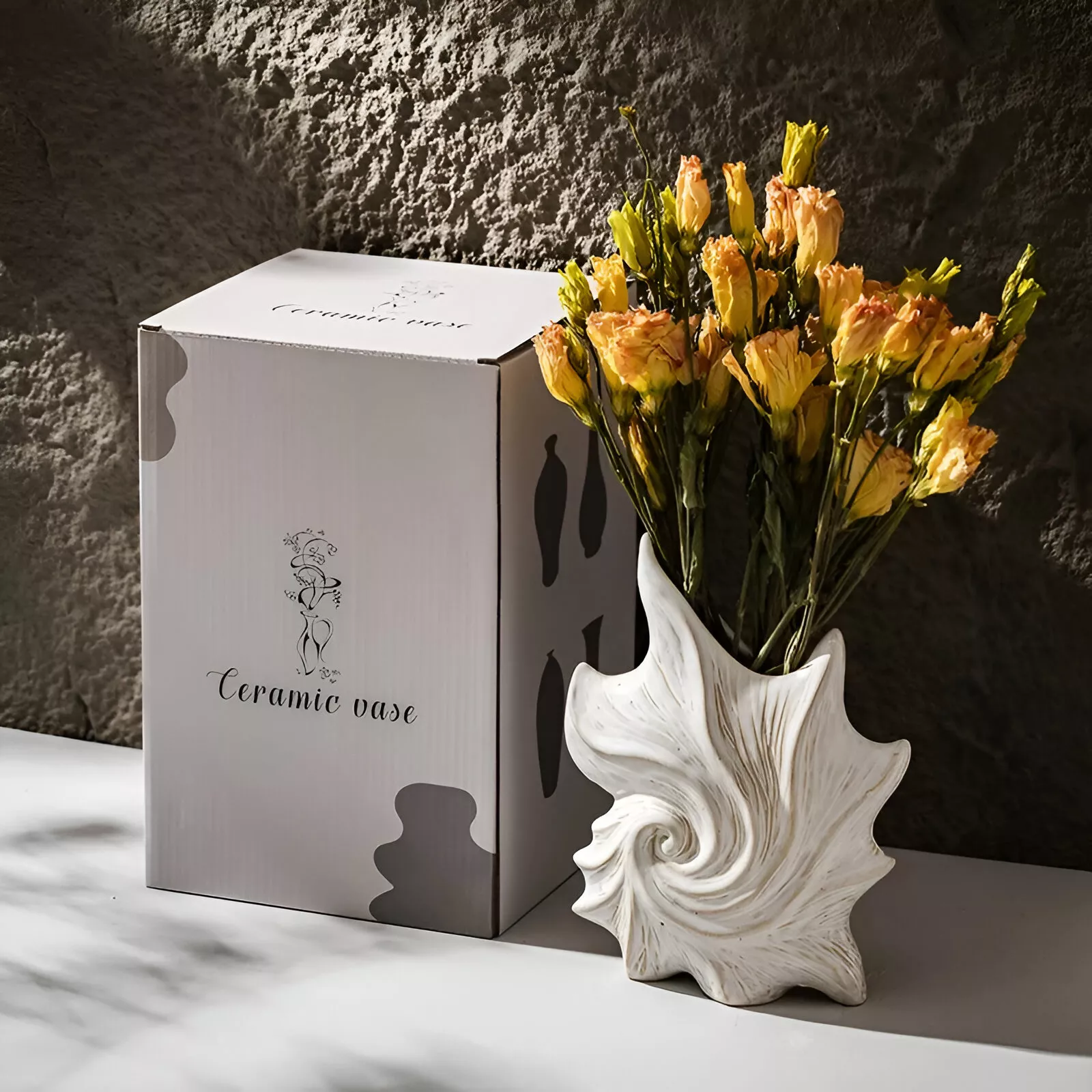 Bring a touch of modern elegance to your home with the stunning Ceramic Conch Vase. Designed with sleek lines and a sculptural silhouette, this eye-catching piece is the perfect fusion of art and functionality. Whether placed on a mantel, bookshelf, or desktop, it stands out as a statement decor accent that adds sophistication to any space. Its unique conch shape blends minimalist design with organic form, making it ideal for modern, contemporary, or Scandinavian interiors.