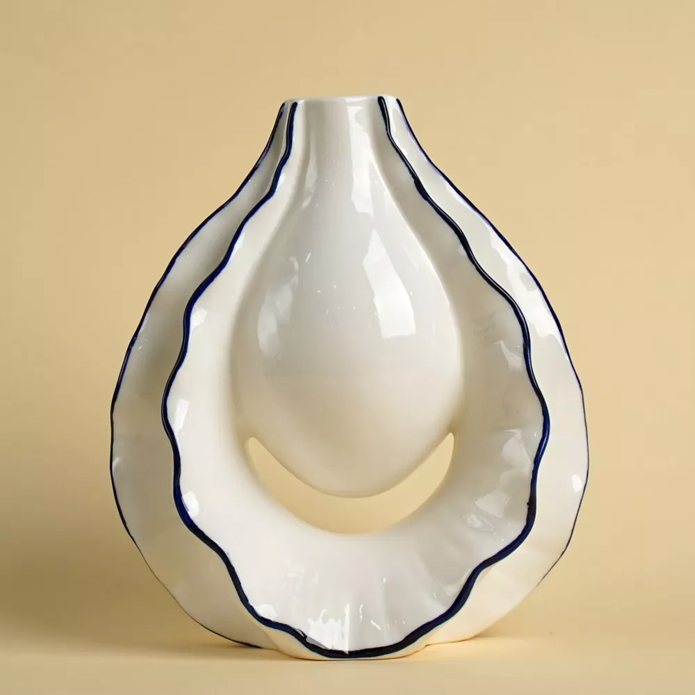Crafted from high-quality ceramic and porcelain, the vase offers durability with an artistic flair. Its sleek oyster-inspired form adds a touch of oceanic sophistication to your table, shelf, or dresser. This mid-sized vessel (approx. 9–12 inches tall) fits seamlessly into both small and spacious settings, making it ideal for a wide range of interior themes from modern minimalism to coastal luxe.