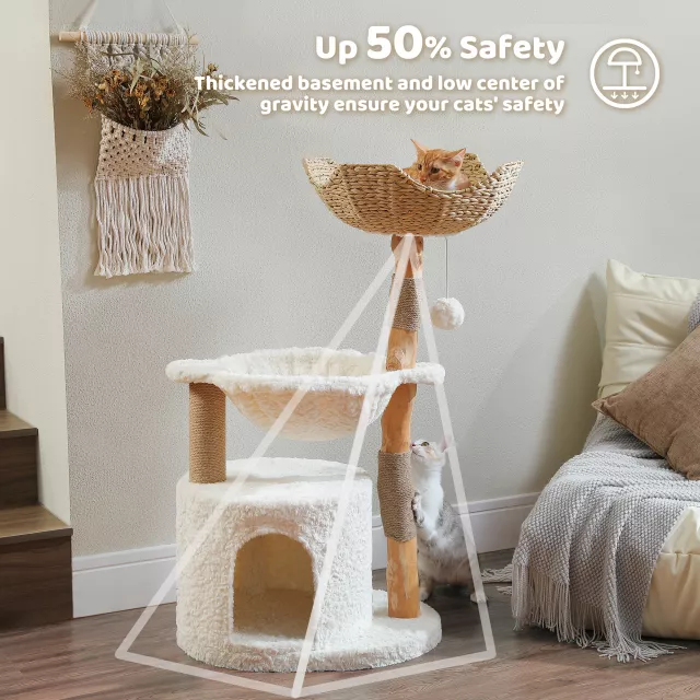 Whether your cat loves to climb, scratch, lounge, or hide, this indoor cat tree has it all. Featuring a spacious bottom condo, a plush hammock that molds to your cat’s body, and a large elevated wicker basket with a soft mat, this tower supports cats of all sizes. The posts are crafted from solid wood trunks for enhanced durability, while the double-thickened wood base keeps everything stable — even during playful pounces.