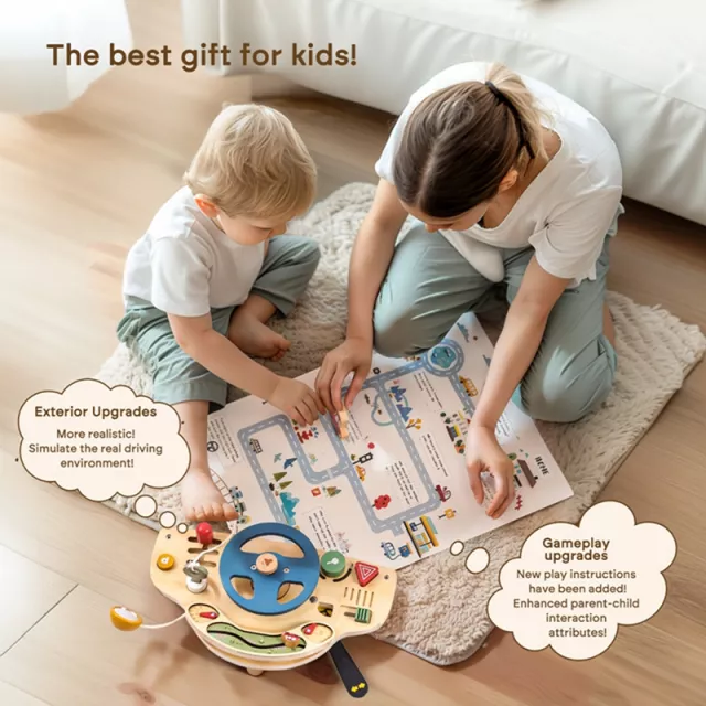 Unlike noisy plastic toys, this wooden sensory set encourages open-ended play with a quiet, calming charm. It’s been thoughtfully designed to balance learning with fun. The train set helps kids understand motion and connection, while the steering wheel busy board invites them to role-play, mimicking real-world driving in a playful setting.