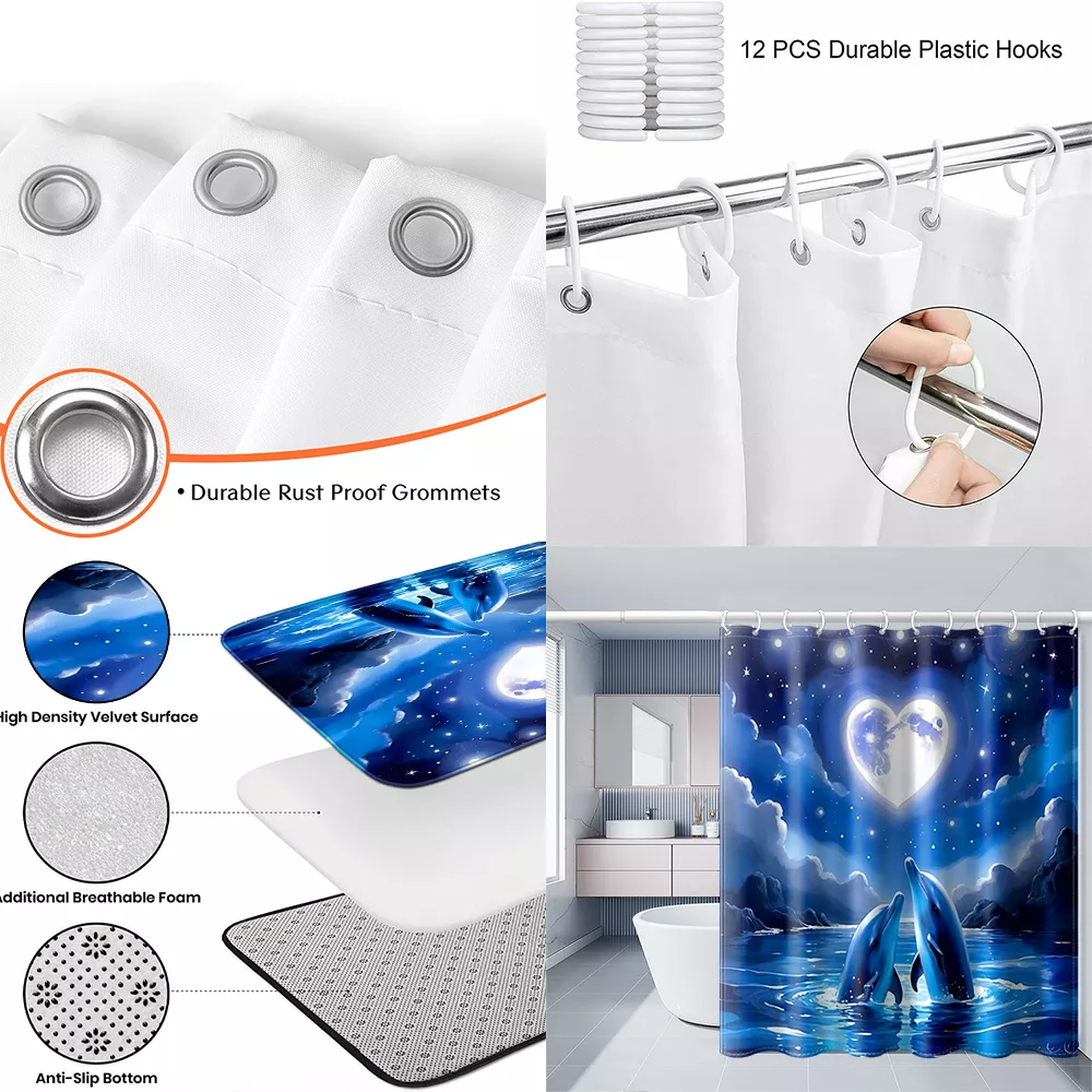 Absolutely love this shower curtain set! It's like having your own little slice of paradise in your home every time you step into your bathroom thanks to its dreamy moonlit dolphin print design inspired by nature’s beauty itself.