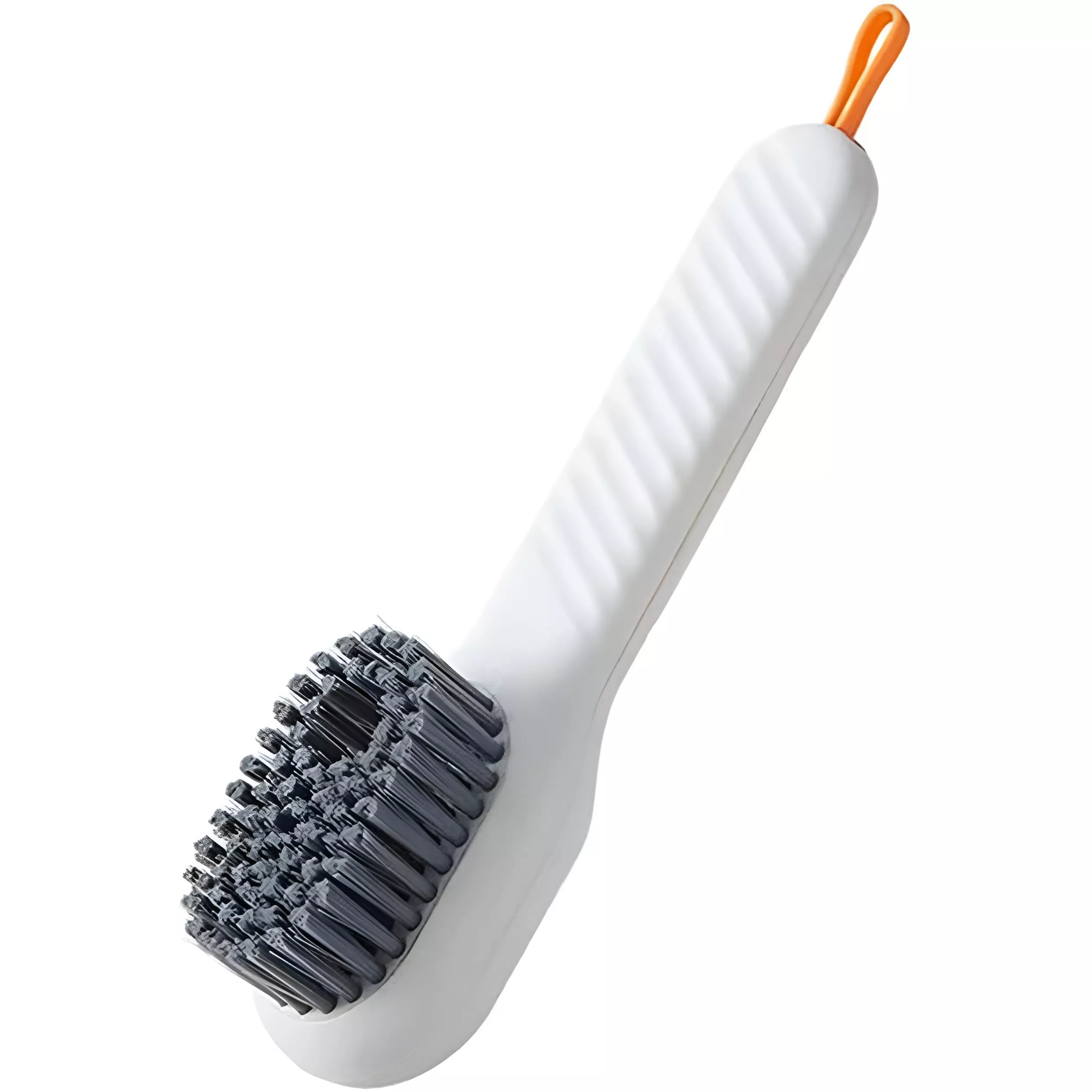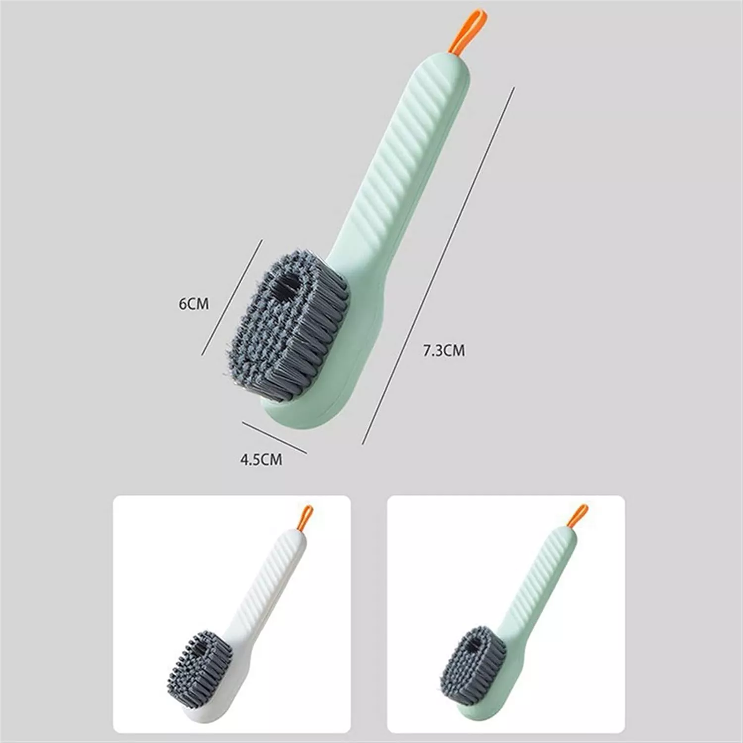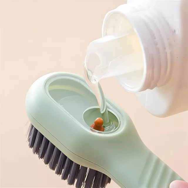 Made from durable plastic, both the handle and the brush bristles are tough enough to tackle dirt and grime, yet gentle enough to use on fabric and soft surfaces. The built-in press-to-dispense feature allows you to load liquid soap or cleaner directly into the brush. Just press and scrub — no extra tools or bottles needed.