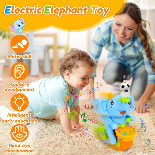 This adorable elephant toy doesn’t just walk—it entertains, engages, and educates. The rhythmic drumming, flashing lights, and vibrant colors stimulate your child’s developing senses, while the soft melodies offer a soothing auditory experience. Whether it’s tummy time, crawling practice, or a spontaneous dance party in the living room, this toy is perfect for babies and toddlers alike.