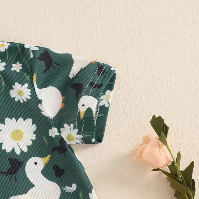 I recently purchased this adorable romper for my newborn niece. I was pleasantly surprised by the quality of the fabric - a super soft polyester blend that feels so gentle against her delicate skin. The duck print is absolutely delightful, perfect for summer fun and photoshoots! What I love most about it though is its practicality - the covered button closure makes dressing her a breeze and it's machine washable too which is such a bonus for new parents dealing with constant laundry.