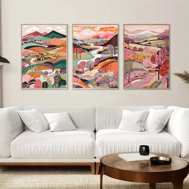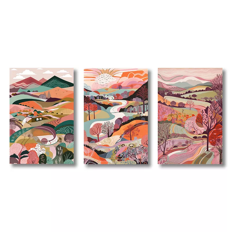 Transform your living space into a calming retreat with this exquisite set of three Pink Landscape Illustrations Canvas Prints. Designed in a soft abstract style, these vertical rectangle wall art pieces feature dreamy landscape compositions in gentle pink tones, adding a modern yet serene touch to any room. Whether you’re styling a minimalist home or seeking a peaceful color palette for your decor, these prints offer a perfect balance of artistic flair and tranquil design.