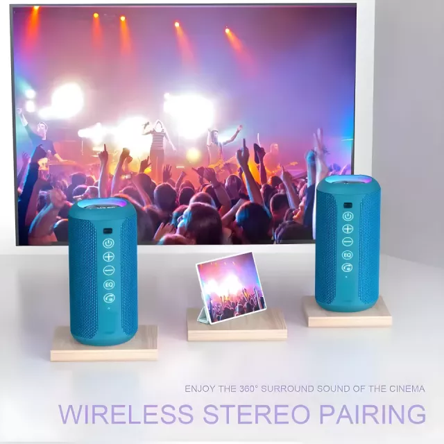 This speaker isn’t just about great sound—it’s a multi-sensory experience. Equipped with a 360° sound design and tri-bass EQ modes, it lets you customize your listening style: switch from clear vocals to booming bass or vibrant 3D audio with a simple tap. The built-in RGB lighting pulses to the beat, creating a vibrant visual show that adds energy to every song.