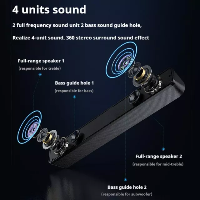Featuring both Bluetooth and wired connectivity, it’s the perfect music companion for your smartphone, tablet, PC, or any device with an AUX output. Even without a built-in battery, this speaker is easy to power using a USB cable—ideal for indoor use or setups near a USB source like a laptop or power bank. The sleek, portable design (11.6 in x 2.2 in x 2.4 in) fits effortlessly into any space while still packing a punch with two high-performance speakers and two sound guide holes for enhanced audio clarity and balance.
