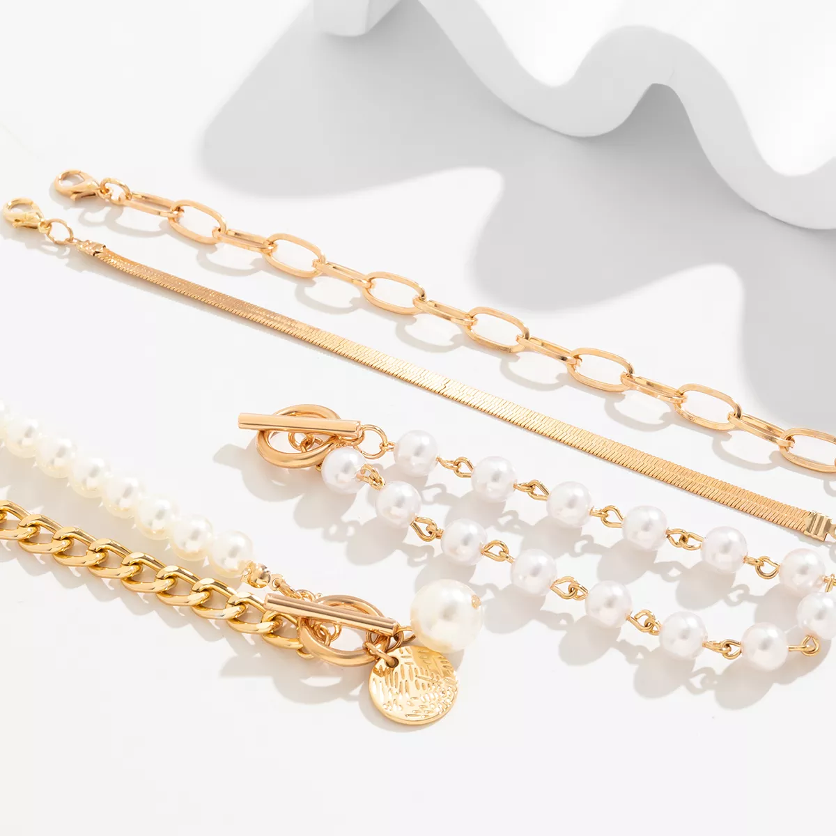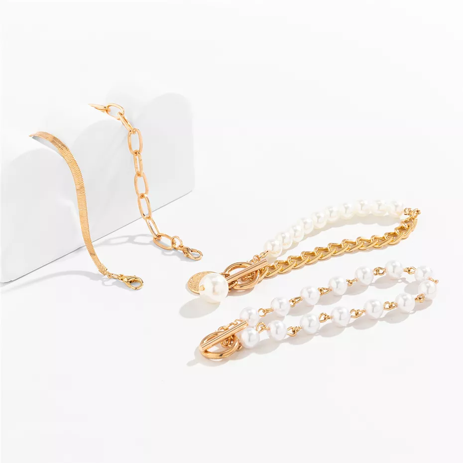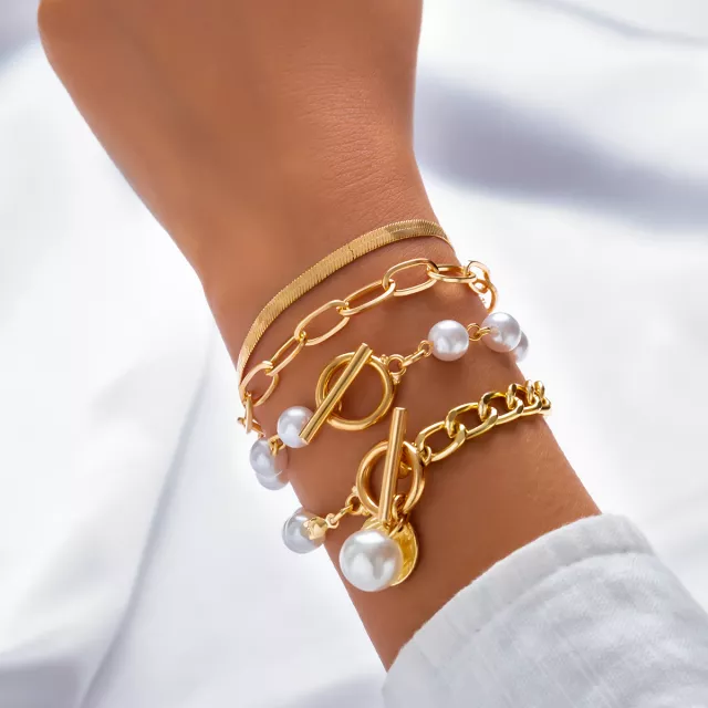 The bracelet features a fashionable snake chain design paired with irregular baroque-shaped imitation pearls, creating a beautifully unpredictable rhythm. A secure OT buckle makes it easy to wear, while offering a bold, stylish centerpiece. Whether you’re walking down the aisle or heading out with friends, this bracelet brings effortless chic with a little punk edge.
