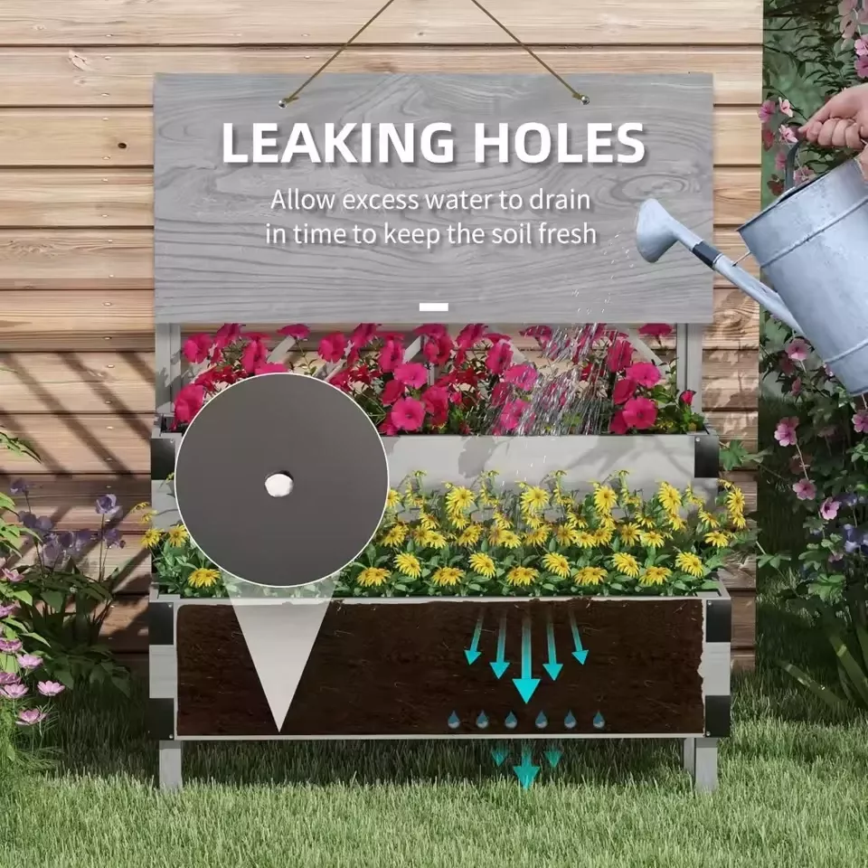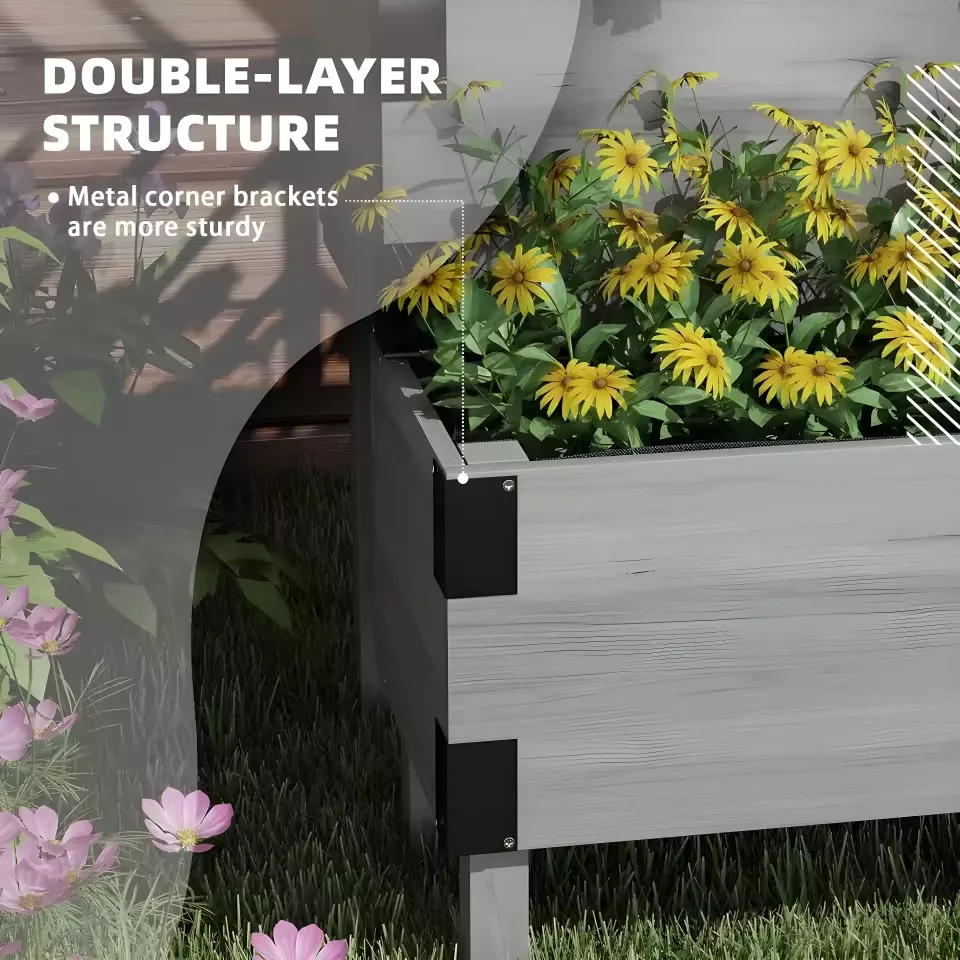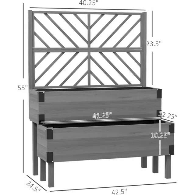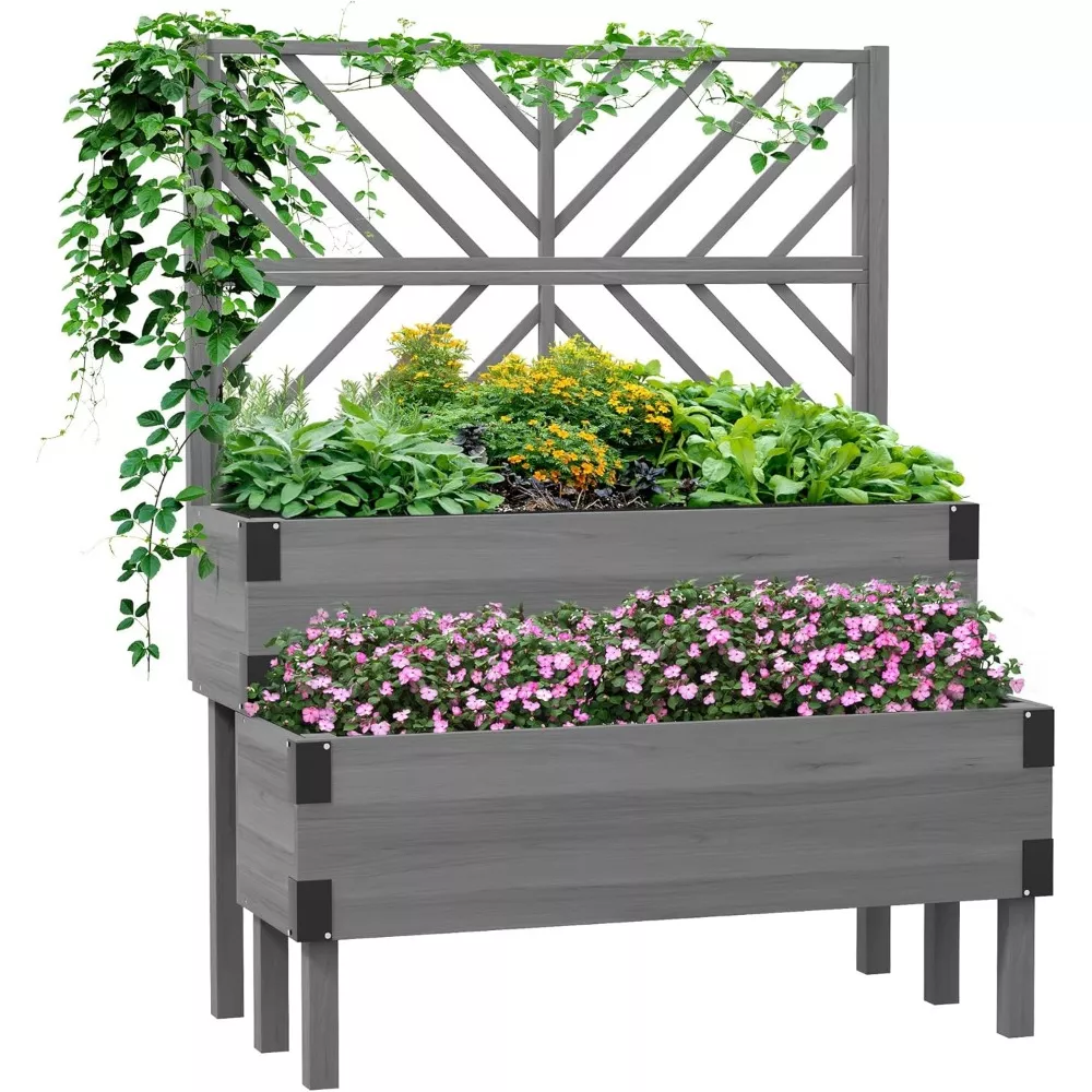 Standing 55 inches tall and built with durable wood and reinforced metal corners, this garden bed blends rustic charm with long-lasting strength. The two-tier layout gives you plenty of room to separate plant types or create a layered planting arrangement, making it easier to organize and manage your garden. At the back, the integrated lattice trellis offers a beautiful vertical accent that supports climbing plants or doubles as a display for hanging pots.