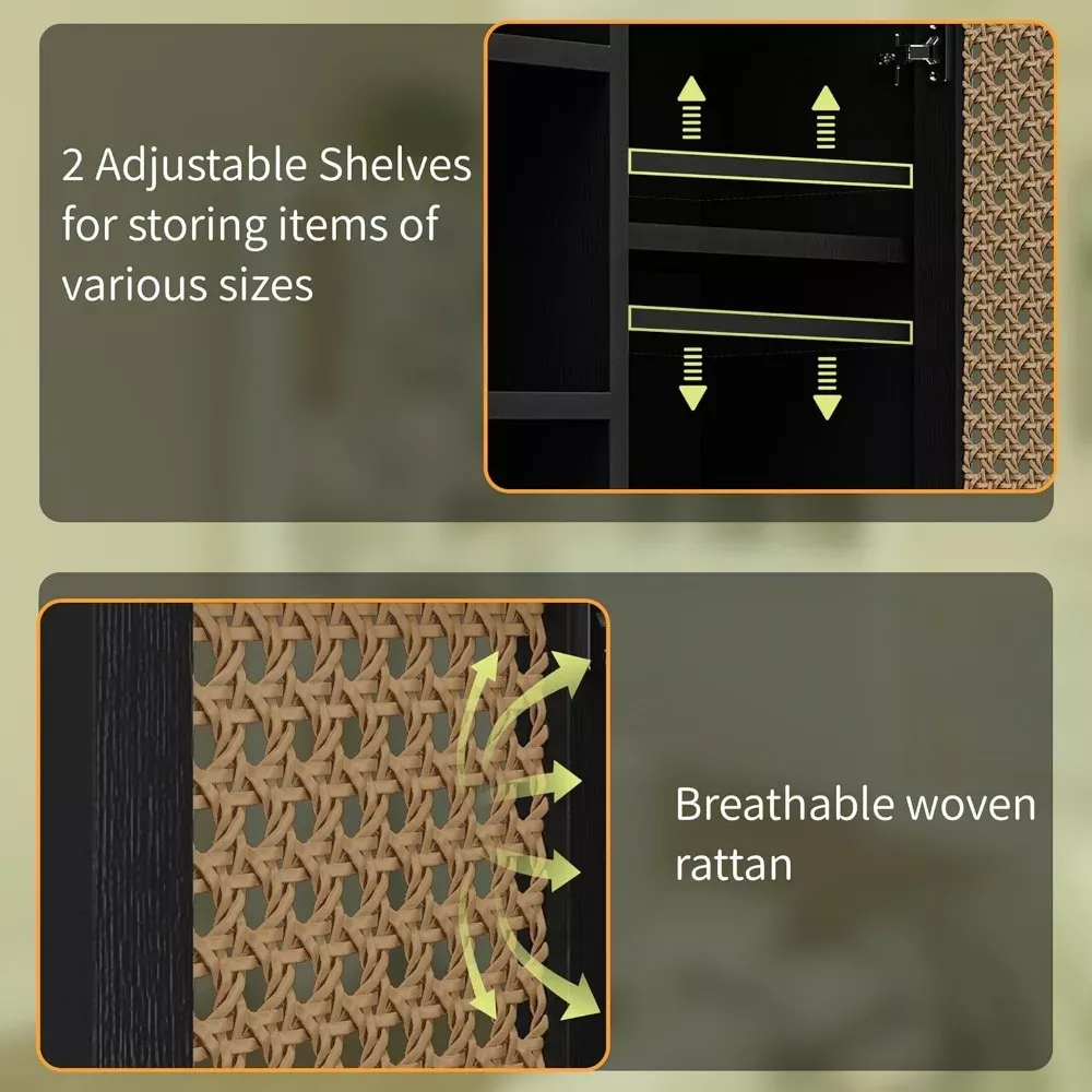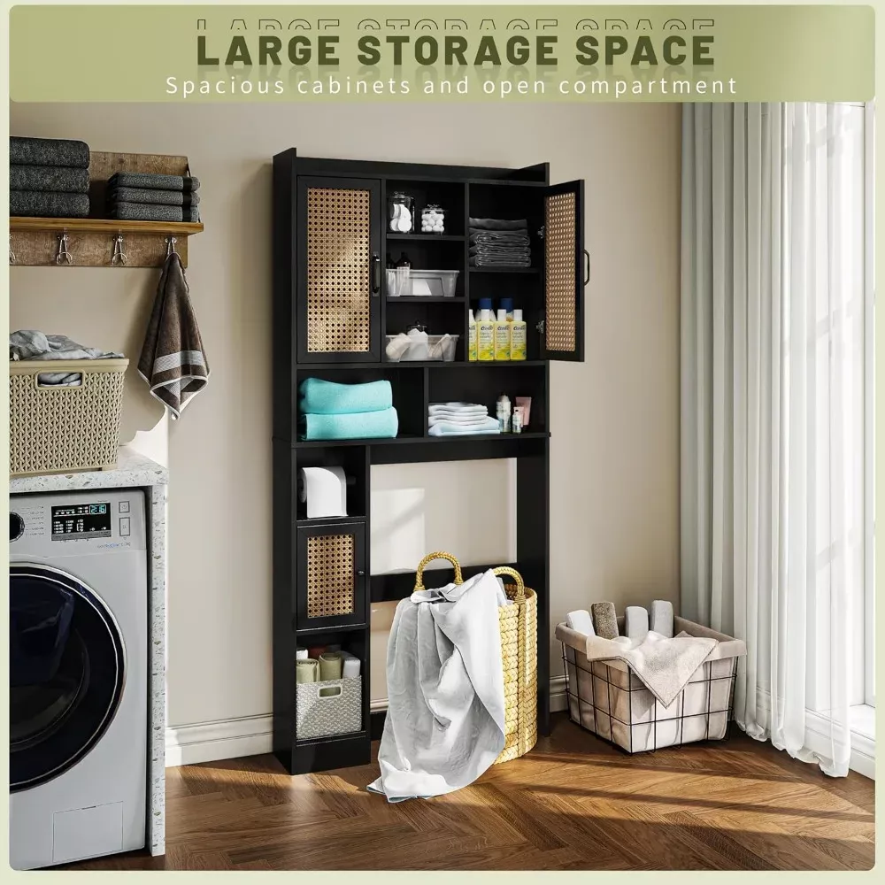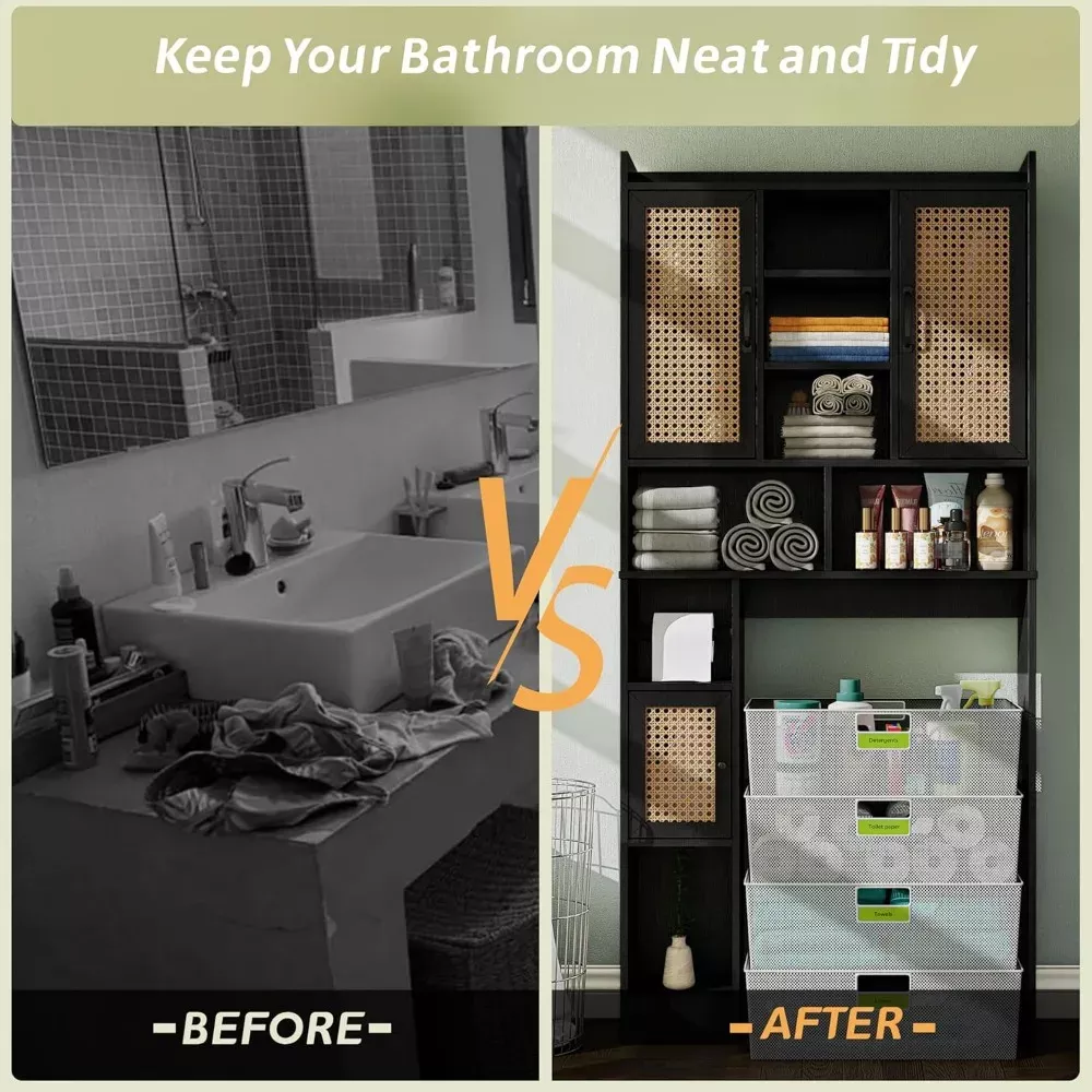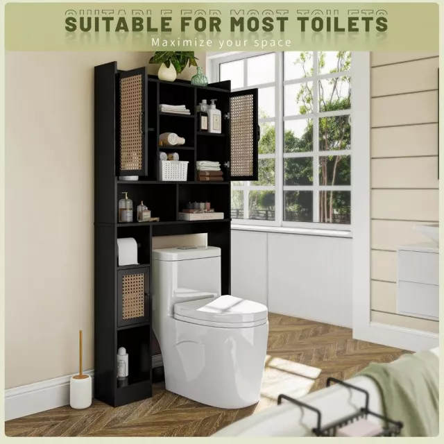Say goodbye to bathroom clutter with this charming rattan-accented storage cabinet that fits perfectly above your toilet. The elegant blend of wood and woven rattan creates a spa-like atmosphere while providing practical storage solutions for all your bathroom essentials. With adjustable shelves and a built-in toilet paper holder, it’s the perfect marriage of form and function.