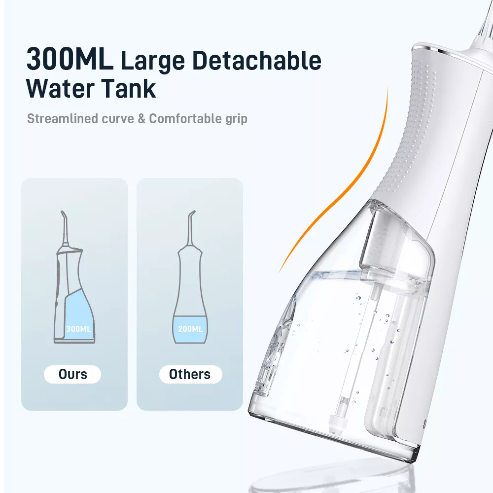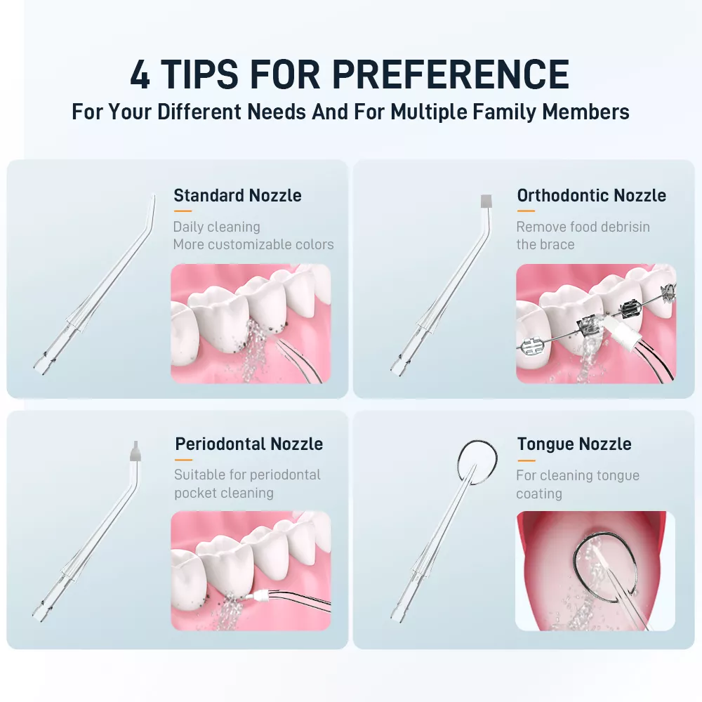 Its large 300ML water tank ensures you can complete your cleaning session in one go, while the rechargeable battery makes it convenient and eco-friendly. Say goodbye to the hassle of replacing batteries constantly. The four nozzles are perfect for multi-user households, and the device’s compact design makes it easy to store or take on the go. Whether you’re at home or traveling, maintaining a fresh and healthy mouth has never been easier.