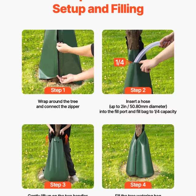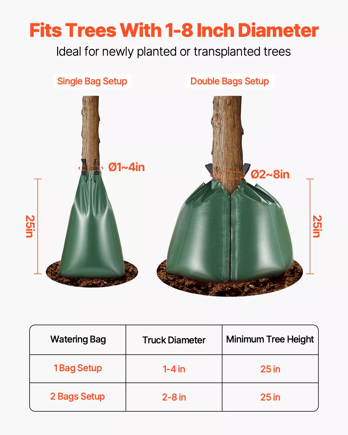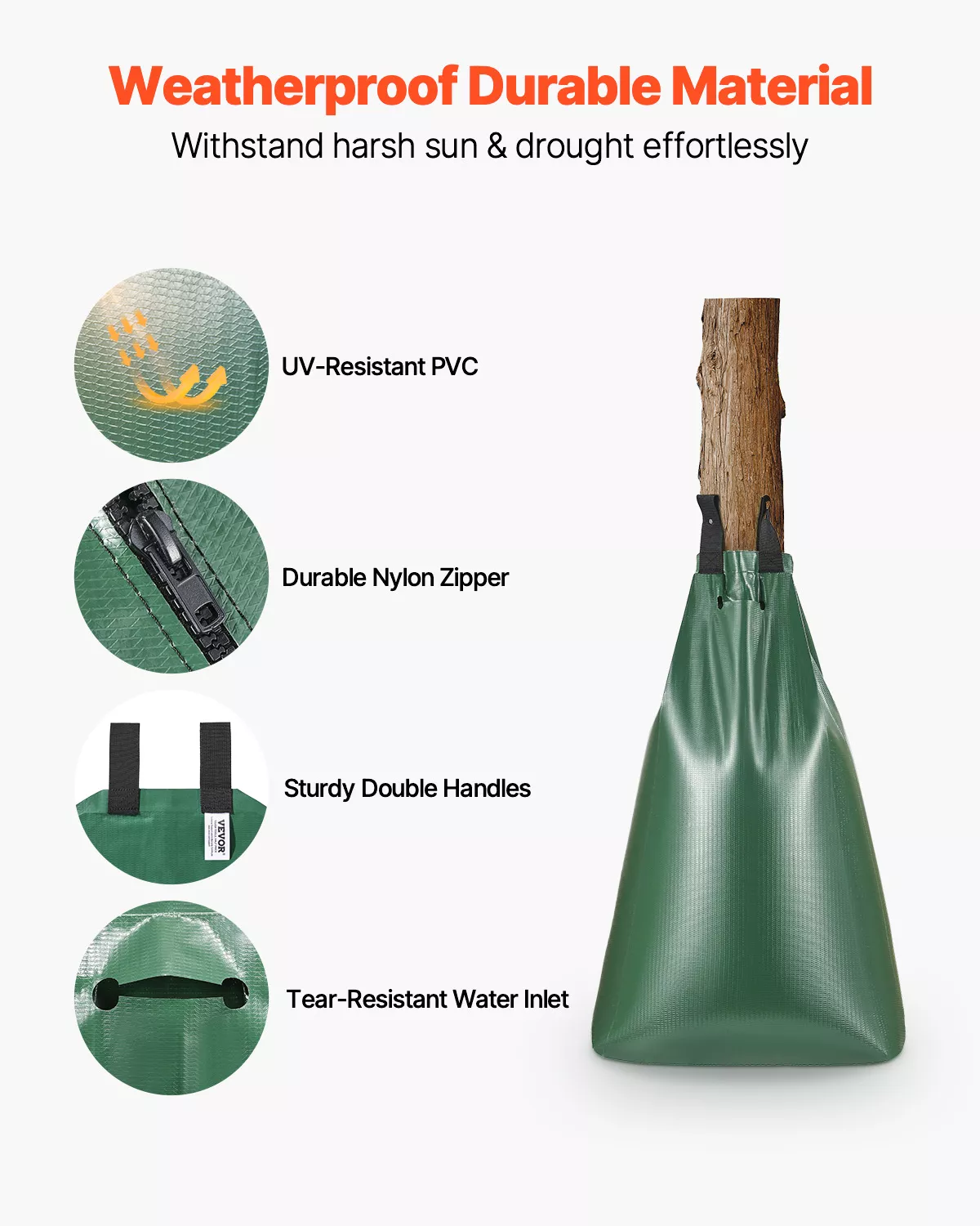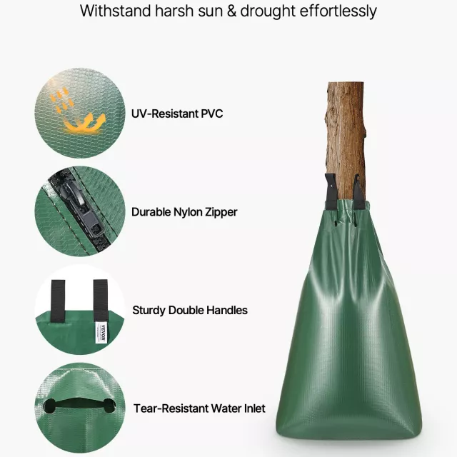 Crafted from heavy-duty, tear-resistant PVC with reinforced nylon zippers and strong handles, this tree watering system is designed for repeated use season after season. It wraps securely around trunks 1 to 4 inches in diameter and can be connected with another bag to fit trees up to 8 inches wide. The wide 3.54-inch fill opening fits standard garden hoses and allows for fast filling in just minutes—no tools, no stress.