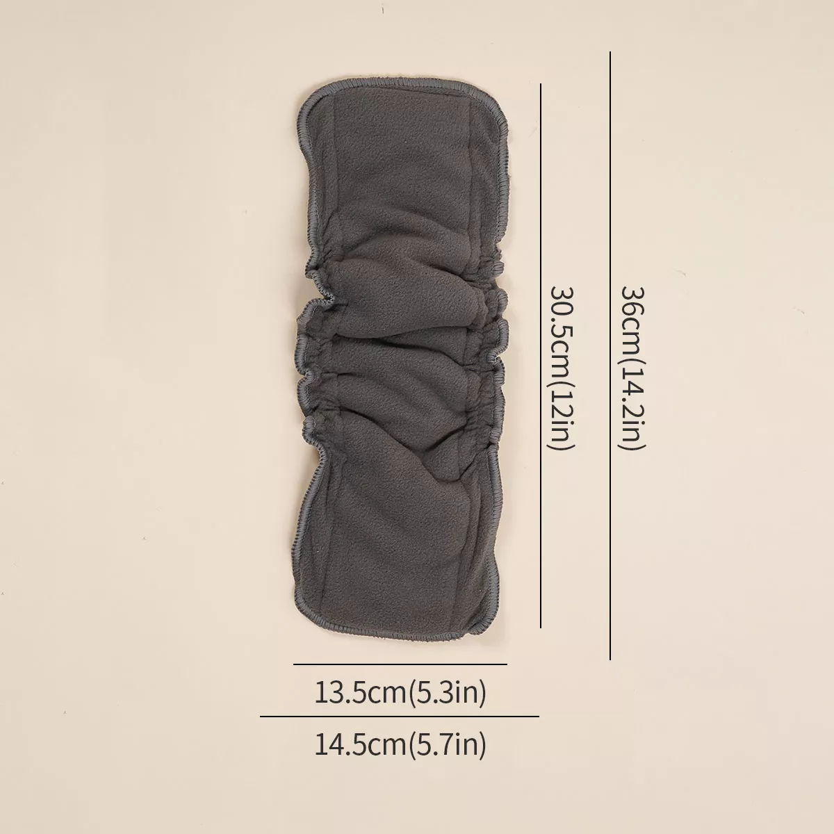 Crafted from ultra-absorbent bamboo charcoal and soft polyester, these inserts are built for both performance and comfort. The elastic edges ensure a snug, leak-resistant fit inside your baby’s diaper cover. Each insert is approximately 13 inches long and 5 inches wide, offering great coverage without adding bulk.