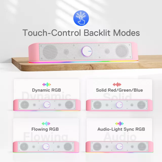 Don’t settle for flat, underwhelming audio from your built-in computer speakers. With this RGB desktop soundbar, every sound—from game explosions to your favorite tunes—comes to life in vivid stereo. The added splash of RGB lighting makes it a centerpiece of any setup, letting you work or play in style. Easy to use, eye-catching, and rich in sound—this is the desktop audio solution you’ve been waiting for.