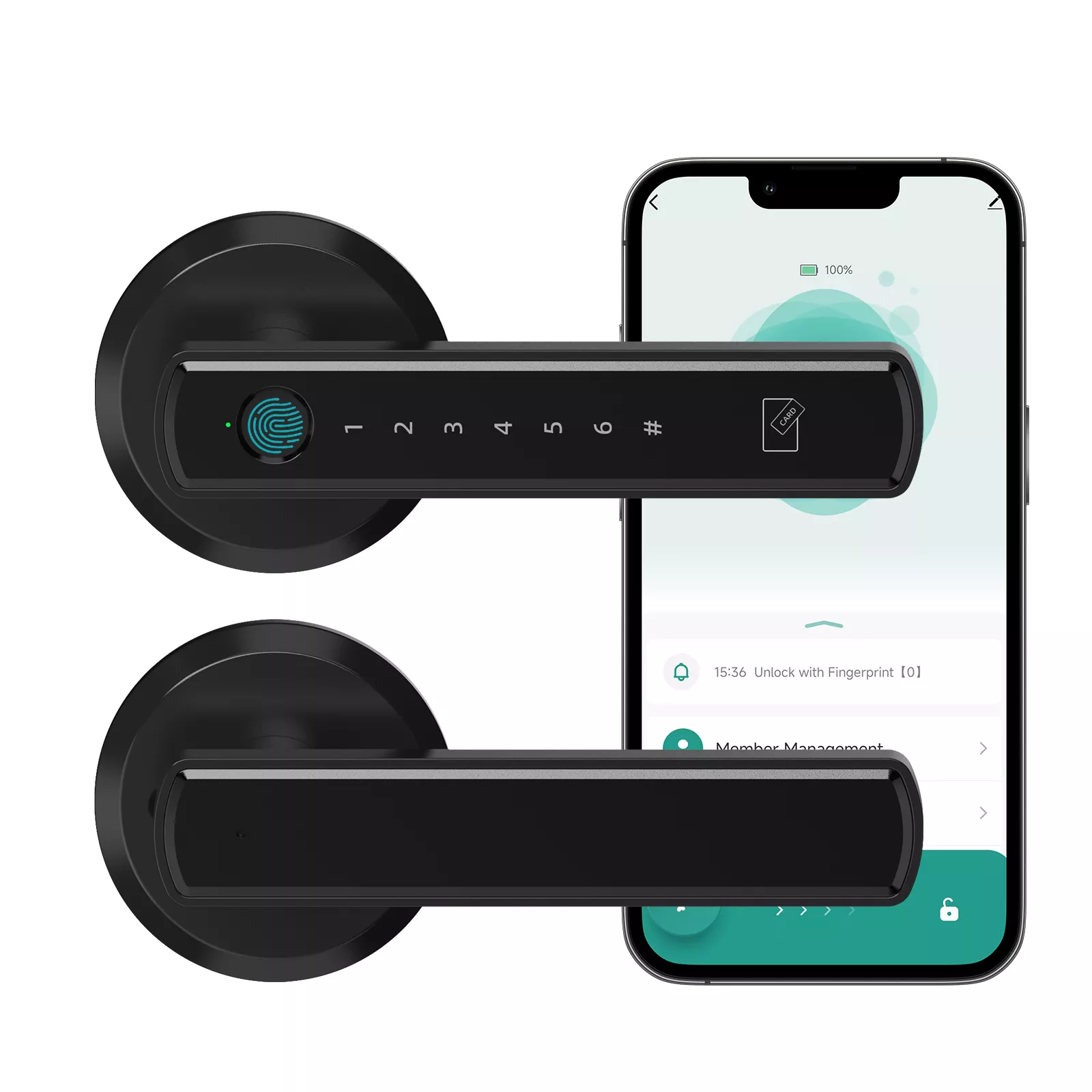 This smart lock combines advanced biometric technology with modern connectivity. Unlock your door with a fingerprint, smartphone app, passcode, Bluetooth, mechanical key, or RFID card — the choice is yours. With an easy-to-use touchscreen keypad and a durable aluminum alloy body, this lock brings both style and strength to any interior door.