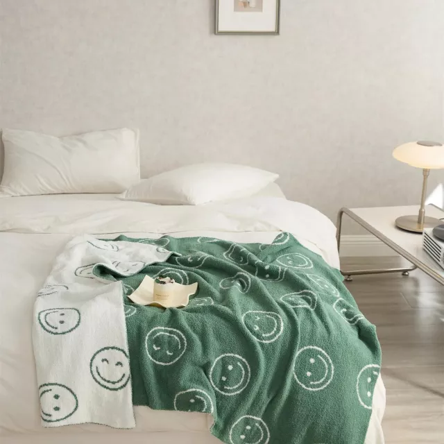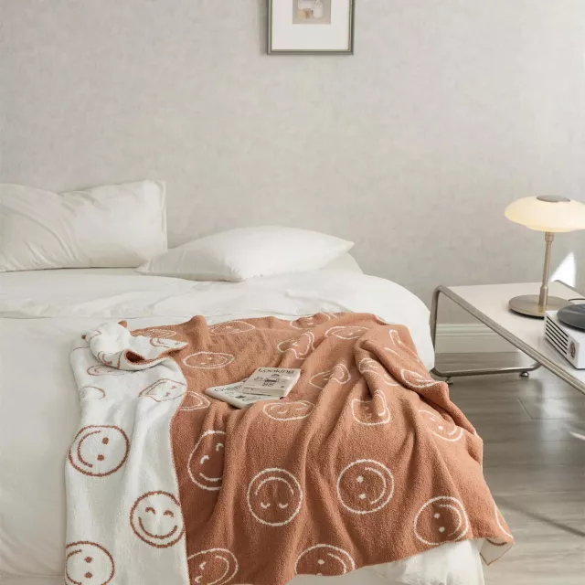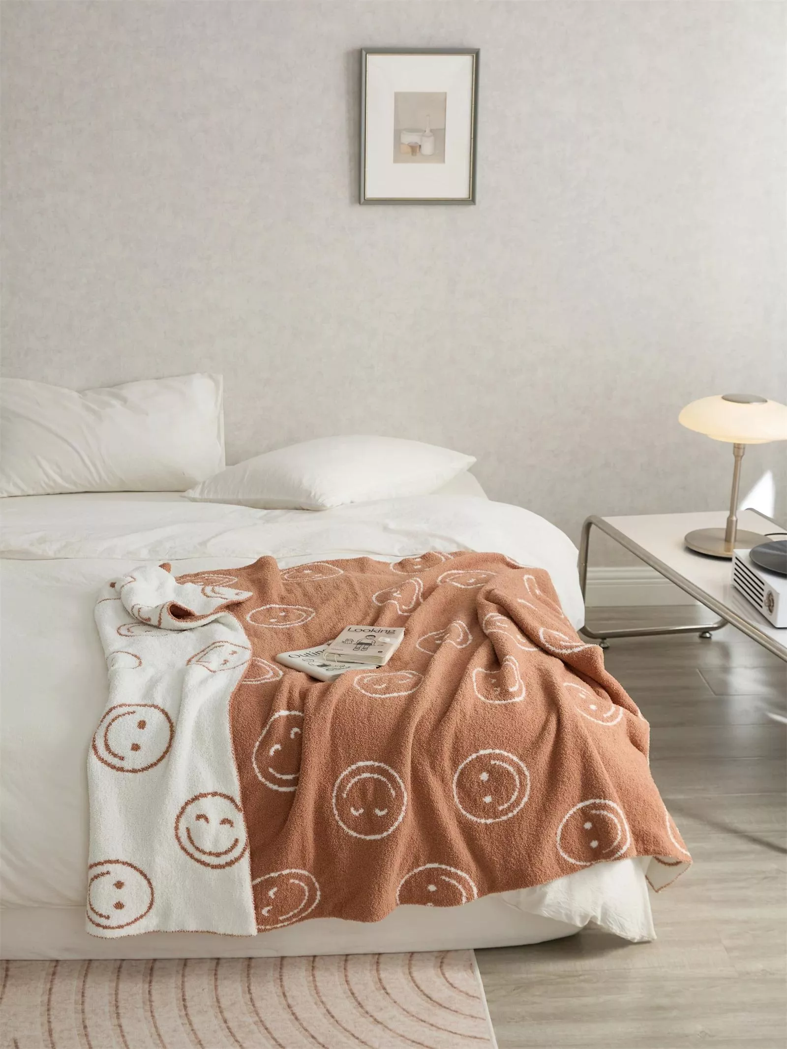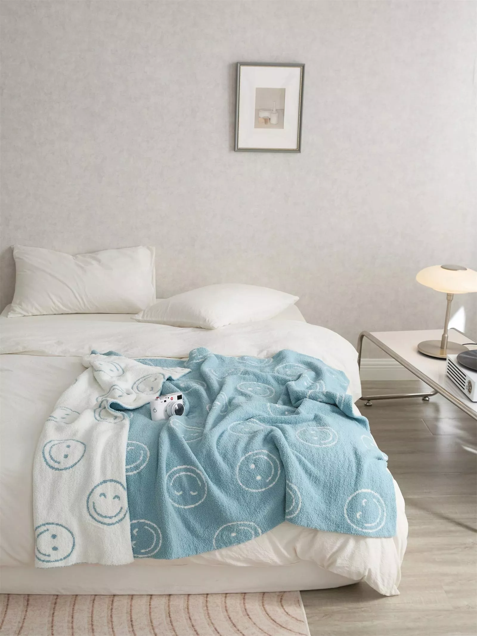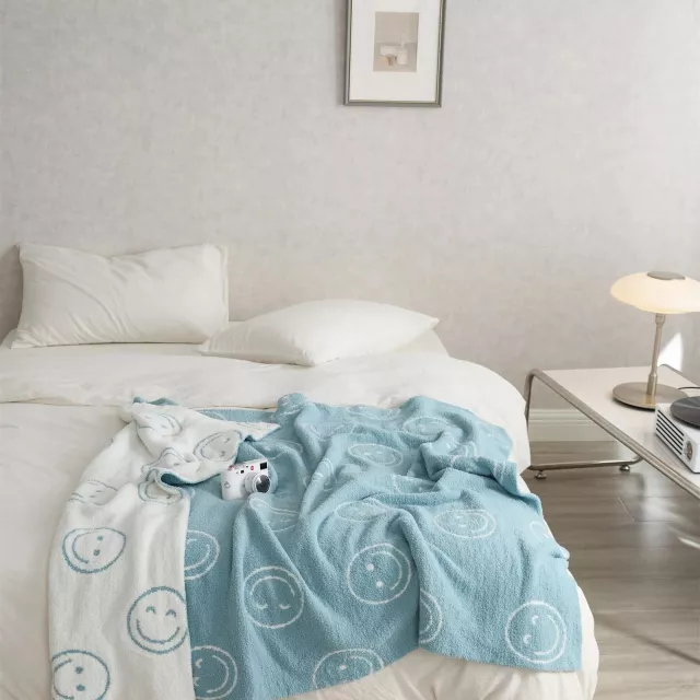 This blanket isn’t just soft—it’s a feel-good essential. The fun cartoon-style smiley face design creates a playful, relaxed vibe in any space. Lightweight and breathable, it’s great for spring and autumn, offering just the right warmth without overheating. The knitted texture adds a touch of elegance, while its softness invites endless snuggling on the couch, in bed, or even during a long workday at the office.