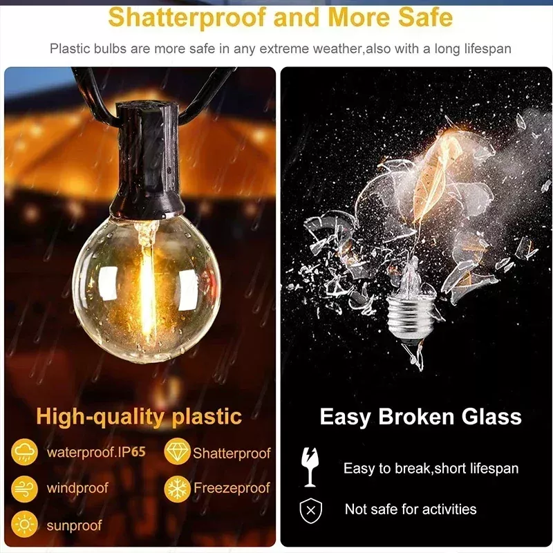 Built to endure the elements, our lights boast an IP65 waterproof rating and a shatterproof design. The durable ABS plastic globes are safe around children and pets and won’t crack under pressure. Whether it’s a sunny summer evening or a snowy winter night, these lights hold strong and shine on. Ideal for year-round use, they’re your go-to lighting choice for outdoor parties, family dinners, weddings, or just relaxing under the stars.