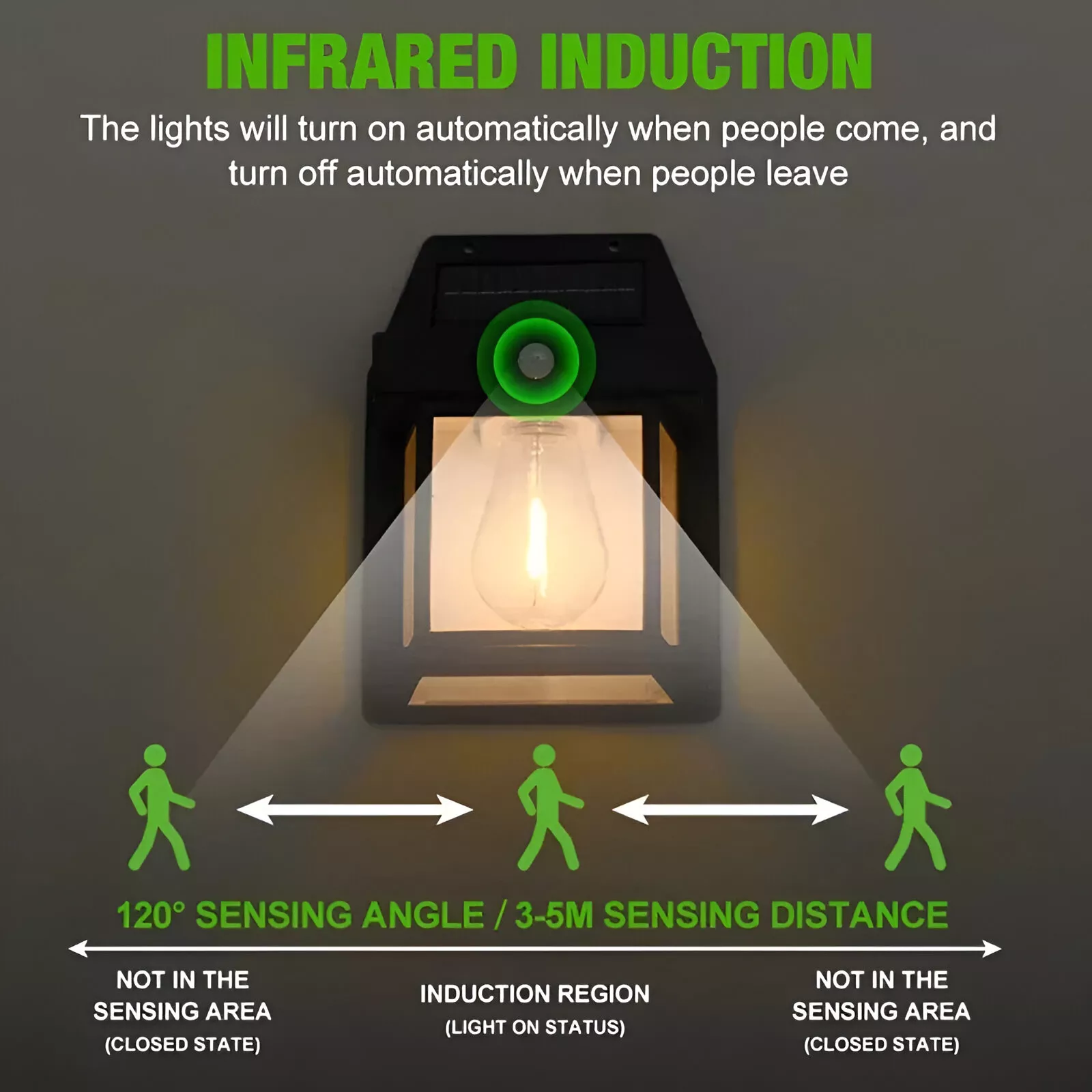 Transform your outdoor space into a beautifully lit, secure haven with our Solar Wall Light with Motion Sensor. Designed to combine elegance with energy efficiency, this sleek black tungsten filament-style lamp delivers reliable illumination while enhancing the charm of any garden, patio, garage, or yard. Powered entirely by the sun, it charges by day and shines automatically at dusk — all without the need for messy wiring or additional electricity costs.