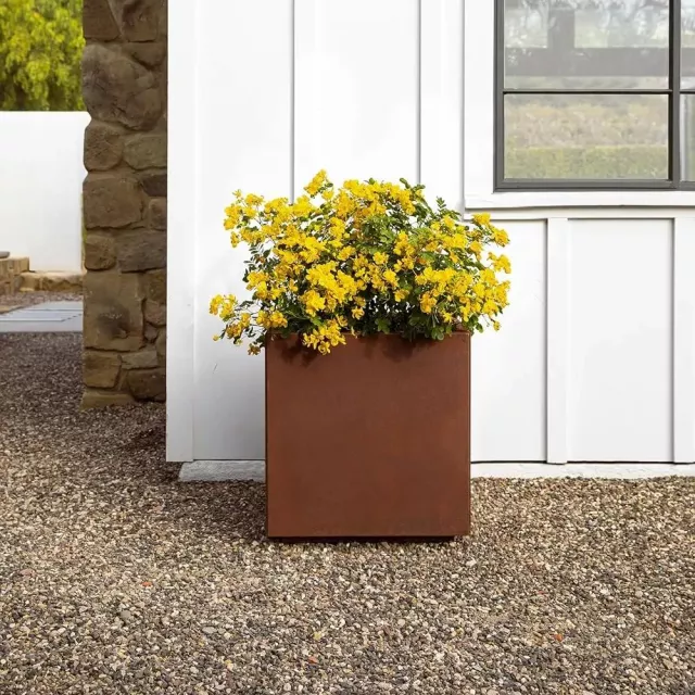 The naturally weathering steel is made to withstand the elements year-round. Rain, snow, or shine, the planter will not only hold up—it will age beautifully. Measuring 22 inches high and 21 inches in both width and length, it’s the ideal size for statement plantings like boxwoods, small trees, or colorful seasonal arrangements. Clean lines and a minimalist cube shape make it a seamless fit for any modern outdoor setting.