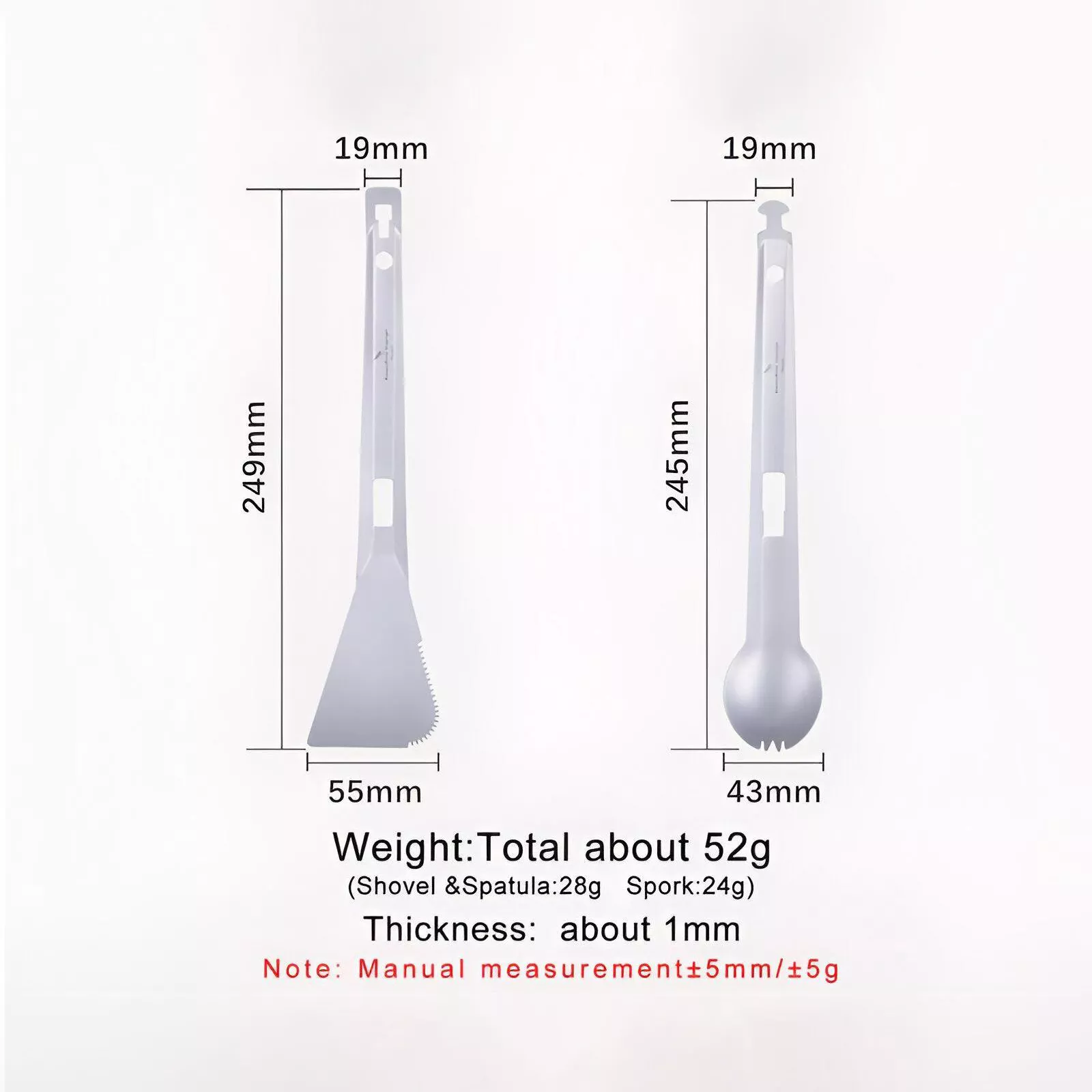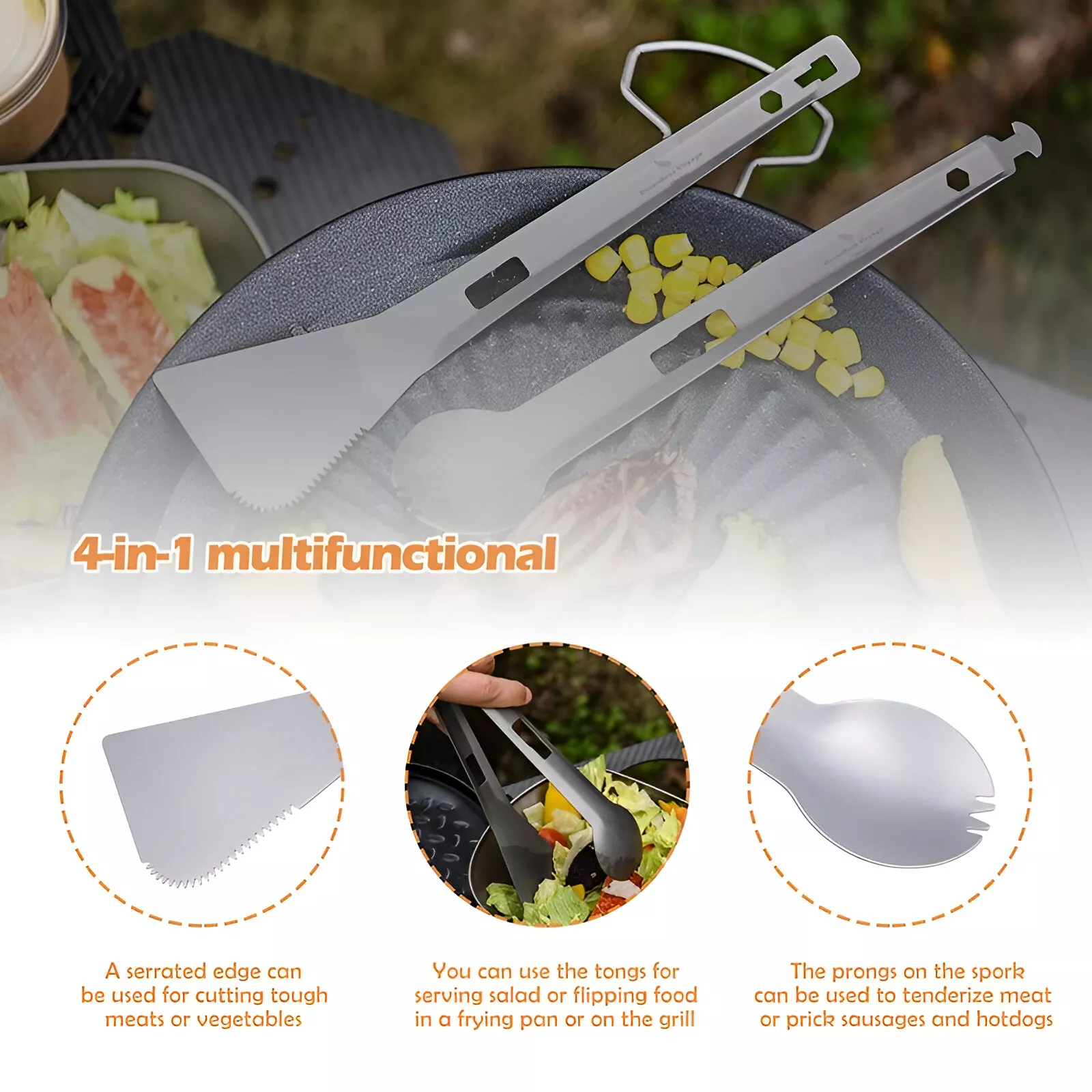 Meet the all-in-one outdoor cooking companion — a versatile titanium utensil designed for campers, hikers, grill masters, and anyone who loves cooking outside. This multi-functional tool combines a spatula, spork, shovel, and tongs in one lightweight, durable set. Whether you’re flipping steaks on a campfire, tossing a fresh salad at a picnic, or serving a sizzling BBQ, this tool is your perfect partner.