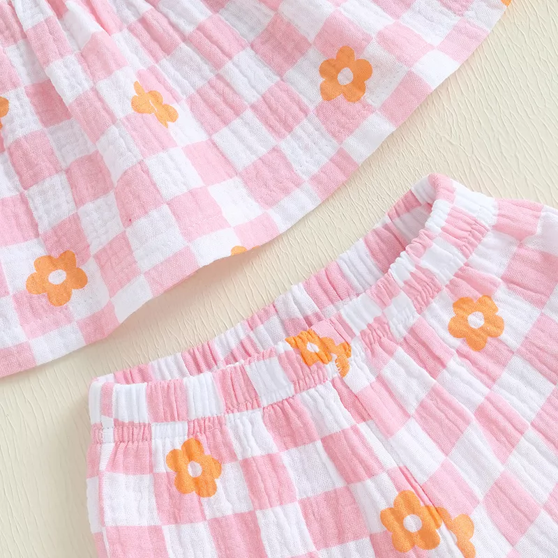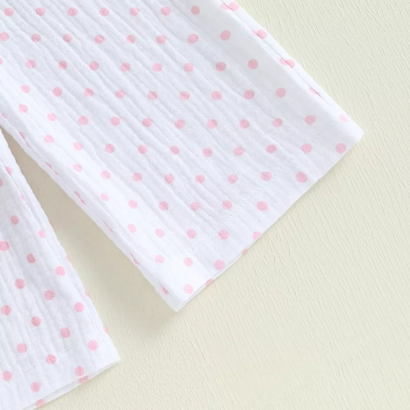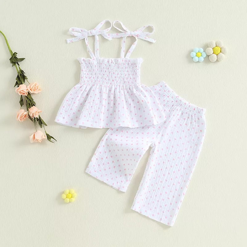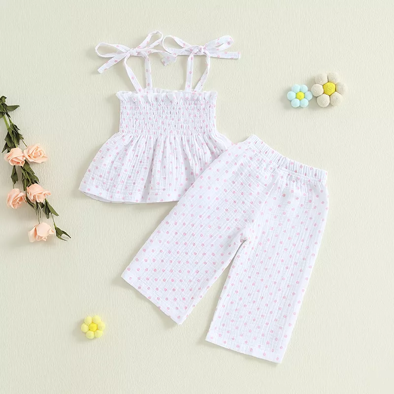 Dress your toddler in the sweetest summer style with this adorable 2-piece outfit. Featuring a lightweight spaghetti strap tank top paired with matching long pants, this set brings playful charm and cool comfort to warm-weather days. The delightful plaid or polka dot prints add a touch of classic cuteness that’s perfect for any occasion — from family outings to everyday play.