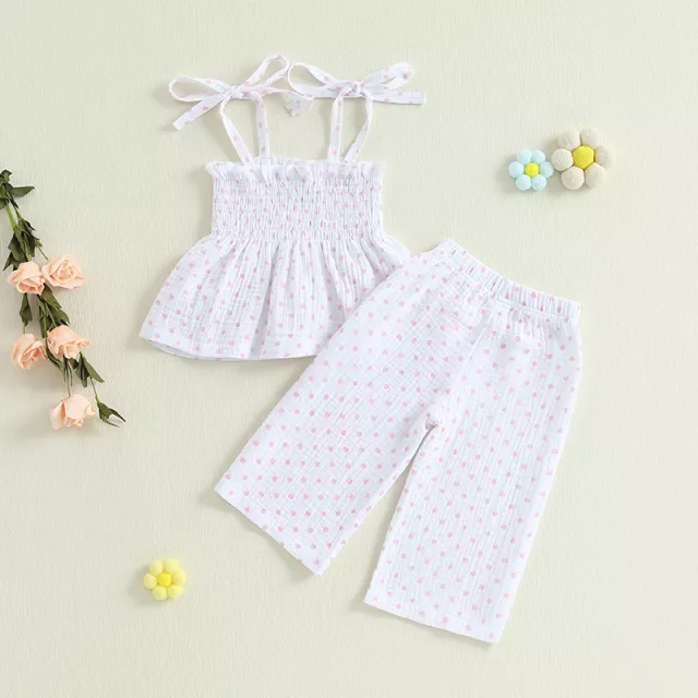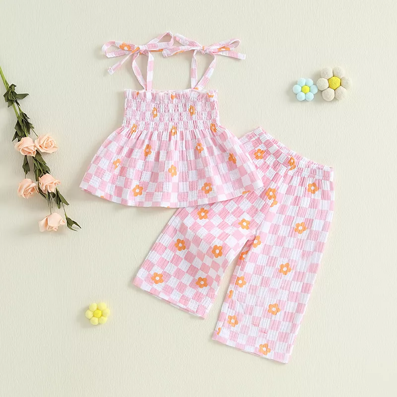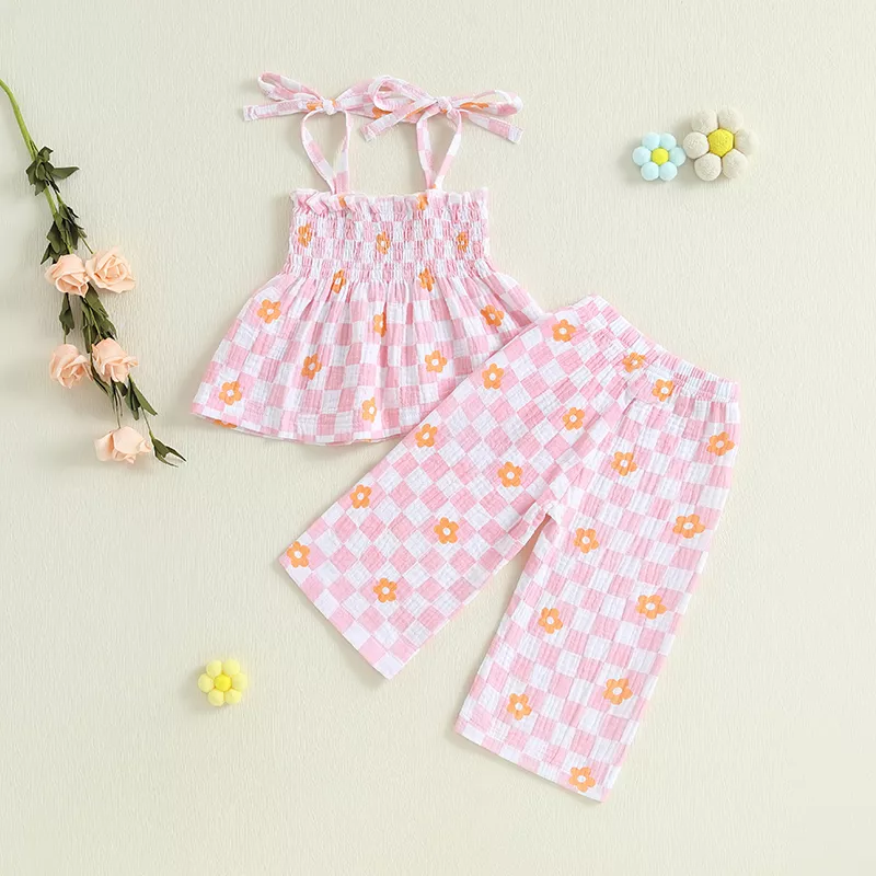 Toddler Girl Summer 2-Piece Outfit Spaghetti Strap Top with Plaid/Dot Pants