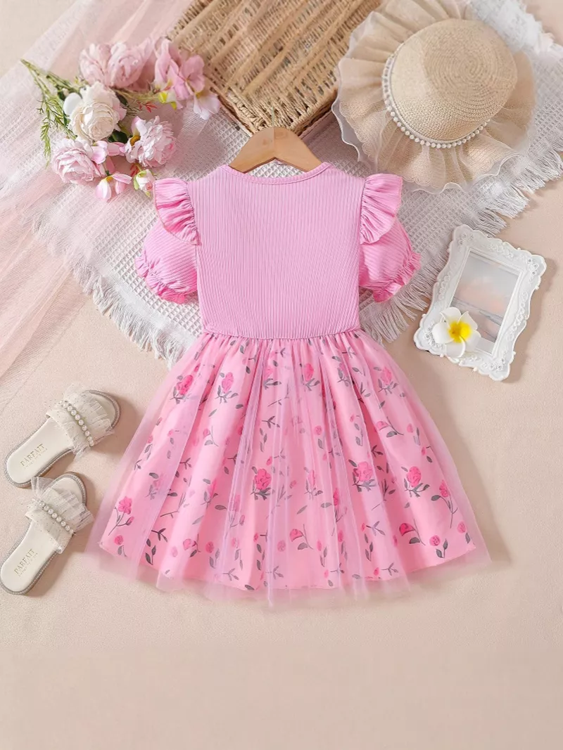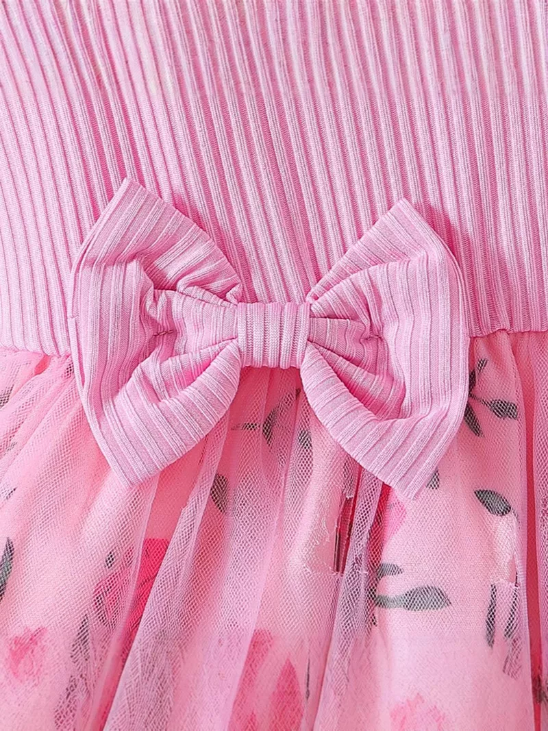 The eye-catching floral patchwork and delicate mesh overlay give it a fairy-tale feel, while the soft cotton-polyester blend ensures breathable comfort all day long. The lightweight, knee-length silhouette is ideal for warm weather and allows your child to move freely and comfortably. A charming bow detail at the waist adds just the right amount of sparkle to this adorable look.