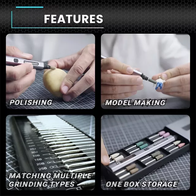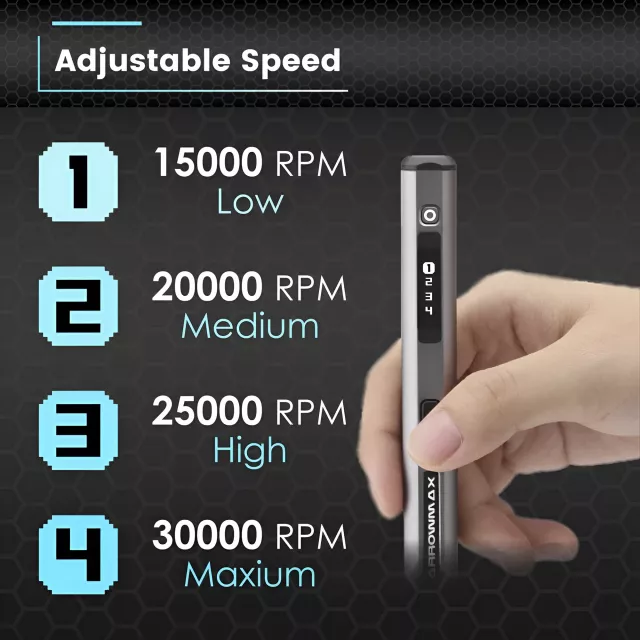Engineered with a user-friendly interface, the pen features a separate power button and gear adjustment button, complemented by a sleek OLED digital display. Quickly switch speeds and monitor performance in real-time for a smoother, more professional experience. With a maximum speed of 30,000 RPM, you’ll be cutting, polishing, and engraving with effortless speed and agility.